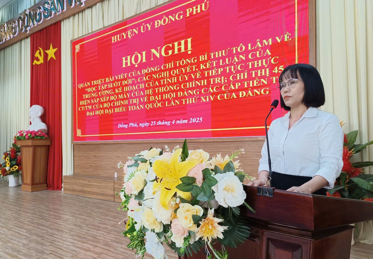 Tại hội nghị, các đại biểu đã được truyền đạt các nội dung, bao gồm: Kế hoạch của Tỉnh ủy về tiếp tục thực hiện sắp xếp tổ chức bộ máy của hệ thống chính trị; Kết luận của Bộ Chính trị hướng dẫn xây dựng phương án nhân sự cấp ủy cấp tỉnh thuộc diện hợp nhất, sáp nhập và cấp xã thành lập mới; Công văn về sắp xếp đơn vị hành chính các cấp và xây dựng mô hình tổ chức chính quyền địa phương 02 cấp về định hướng một số nhiệm vụ sắp xếp đơn vị hành chính và tổ chức chính quyền địa phương 02 cấp; Hướng dẫn thành lập tổ chức đảng tương ứng các đơn vị hành chính ở địa phương và sắp xếp tổ chức bộ máy cơ quan Mặt trận Tổ quốc Việt Nam, đoàn thể cấp tỉnh, cấp xã. Một số điểm mới trong Chỉ thị số 45-CT/TW ngày 14/4/2025 của Bộ Chính trị về Đại hội Đảng các cấp tiến tới đại hội đại biểu toàn quốc lần thứ XIV của Đảng; Các văn bản liên quan đến chính sách, chế độ đối với cán bộ, công chức, viên chức, người lao động trong thực hiện sắp xếp bộ máy của hệ thống chính trị; Bài viết của đồng chí Tổng Bí thư Tô Lâm về “Học tập suốt đời”.