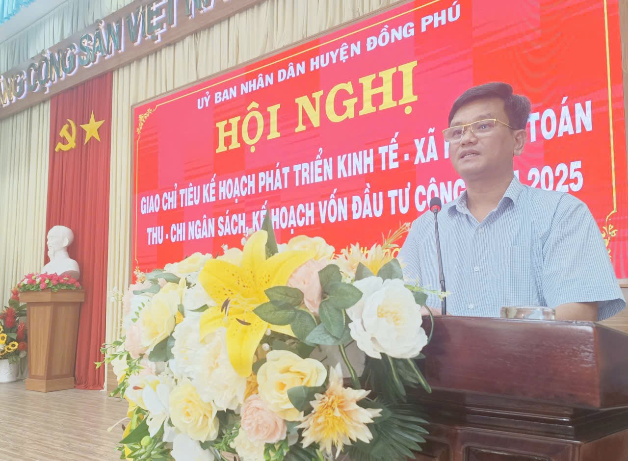 Phát biểu tại hội nghị, Chủ tịch UBND huyện Đồng Phú Lê Văn Trân nhận định: 2025 là năm cuối của nhiệm kỳ 2020 - 2025, có ý nghĩa quan trọng trong việc hoàn thành mục tiêu kế hoạch 5 năm, huyện Đồng Phú đề ra 18 chỉ tiêu phát triển kinh tế - xã hội, thực hiện sắp xếp bộ máy tinh gọn - hiệu lực - hiệu quả; tổ chức thành công Đại hội Đảng bộ các cấp tiến tới Đại hội đại biểu toàn quốc lần thứ XIV của Đảng. UBND huyện yêu cầu các ngành, địa phương chủ động, tích cực triển khai thực hiện có hiệu quả các chỉ tiêu theo nghị quyết của HĐND huyện giao và các chương trình, kế hoạch công tác với những giải pháp đột phá, mạnh mẽ, phù hợp với tình hình thực tiễn, có tính khả thi cao nhằm thực hiện và hoàn thành các chỉ tiêu, nhiệm vụ đã đề ra.