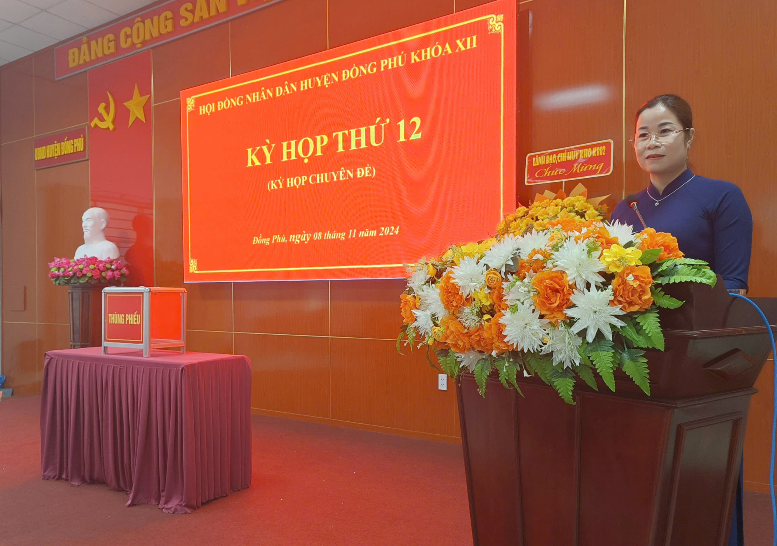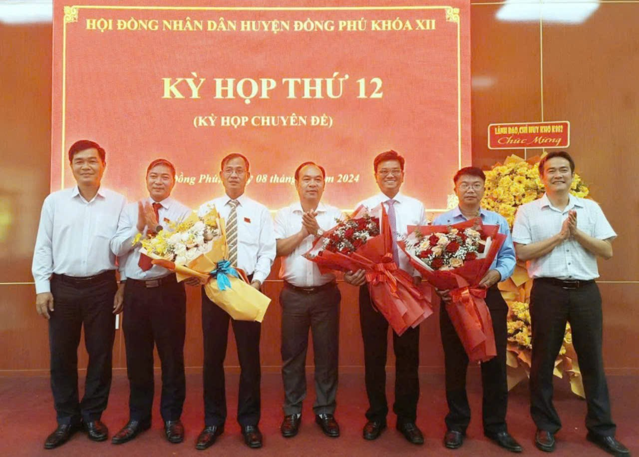 Kỳ họp đã thông qua Tờ trình cho thôi làm nhiệm vụ Đại biểu HĐND huyện khóa XII, nhiệm kỳ 2021-2026 đối với ông Nguyễn Anh Tuấn, Nguyên Chủ tịch UBND huyện do chuyển công tác; bầu bổ sung ông Lê Văn Trân, Quyền Chủ tịch UBND huyện Đồng Phú giữ chức Chủ tịch UBND huyện Đồng Phú khóa XII, nhiệm kỳ 2021-2026. Miễn nhiệm chức danh Trưởng Ban Dân tộc HĐND huyện khóa XII, nhiệm kỳ 2021-2026 đối với ông Thạch Kim Thành do điều động giữ chức Phó trưởng Ban Dân vận Huyện ủy và bầu ông Lã Quốc Tuấn giữ chức Trưởng Ban Dân tộc, HĐND huyện khóa XII, nhiệm kỳ 2021-2026. Đồng thời, bầu bổ sung thành viên UBND huyện Đồng Phú khóa XII, nhiệm kỳ 2021-2026 đối với ông Nguyễn văn Đốc, Chánh Thanh tra huyện Đồng Phú.