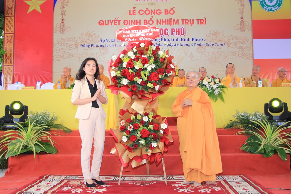 Bà Nguyễn Thị Vân Anh, HUV, Phó Chủ tịch Ủy ban MMTQ huyện tặng hoa chúc mừng tịnh xá