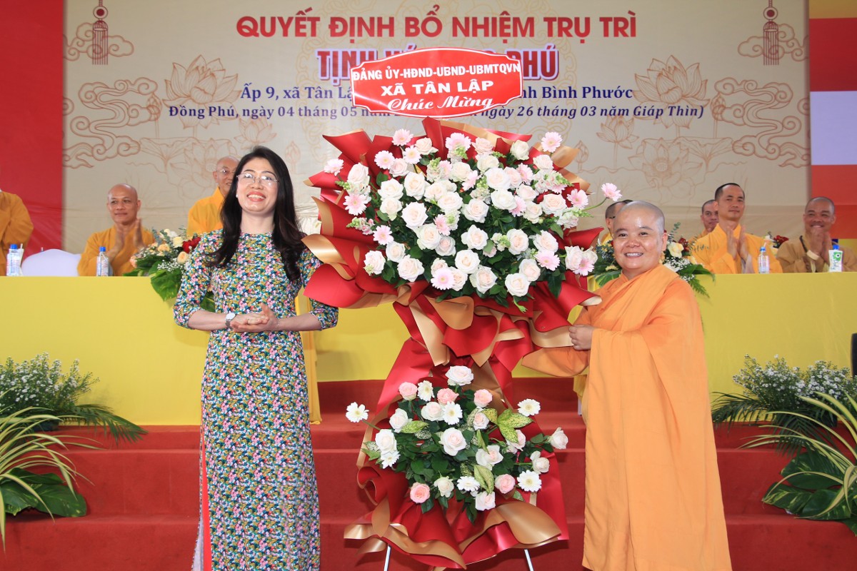Bà Phan Thị Hoa, HUV, Bí thư Đảng ủy xã Tân Lập tặng hoa chúc mừng tịnh xá