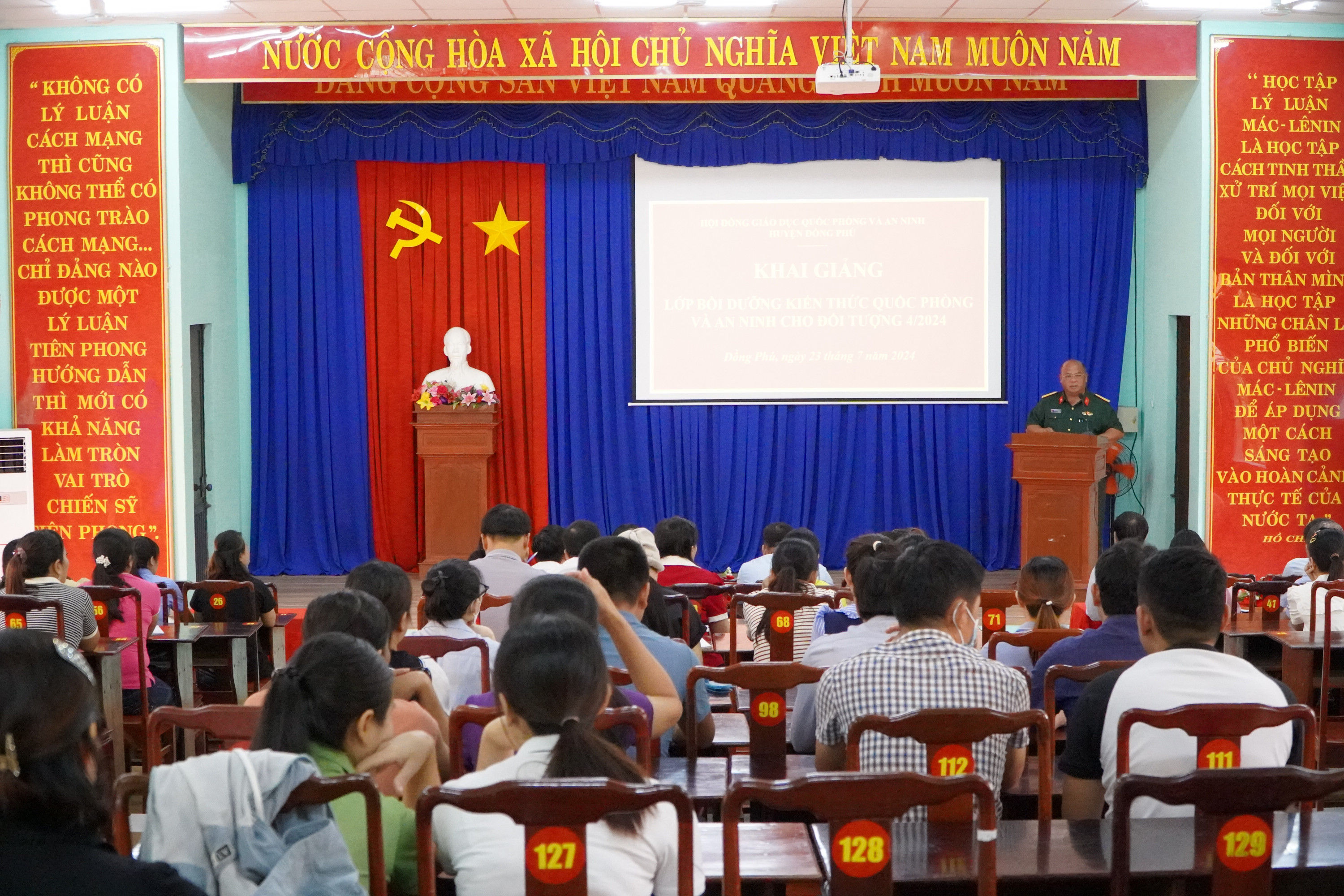 Sáng 23-7, Hội đồng giáo dục Quốc phòng và An ninh (QP&AN) huyện Đồng Phú phối hợp cùng Trung tâm Chính trị huyện tổ chức khai giảng lớp bồi dưỡng kiến thức QP&AN cho đối tượng 4, khóa I năm 2024. Thượng tá Phan Việt Phương, Ủy viên Ban thường vụ Huyện ủy, Chỉ huy trưởng Ban CHQS huyện cùng lãnh đạo Đảng ủy Ban CHQS huyện, Trung tâm Chính trị huyện dự lễ khai giảng.
