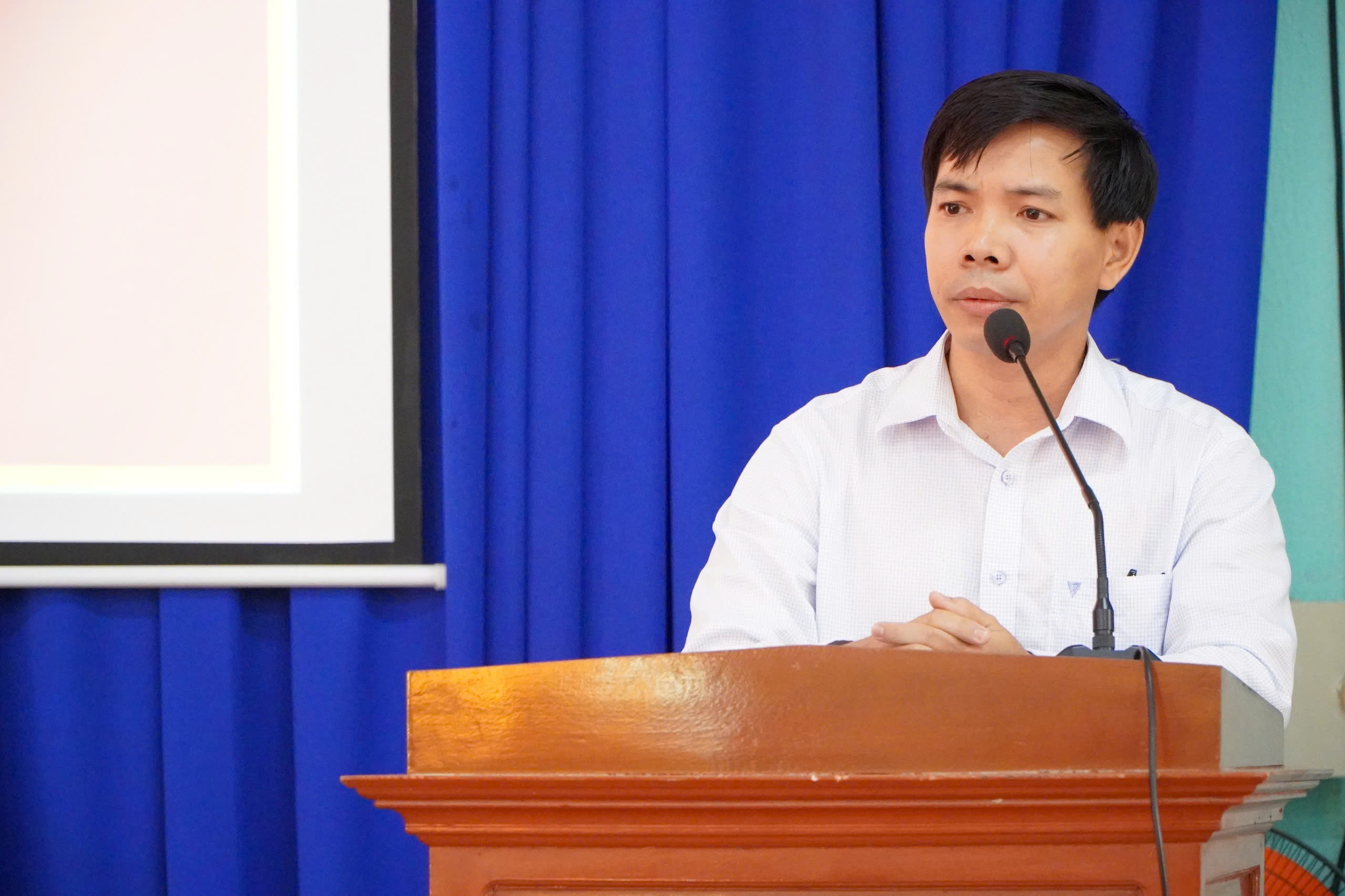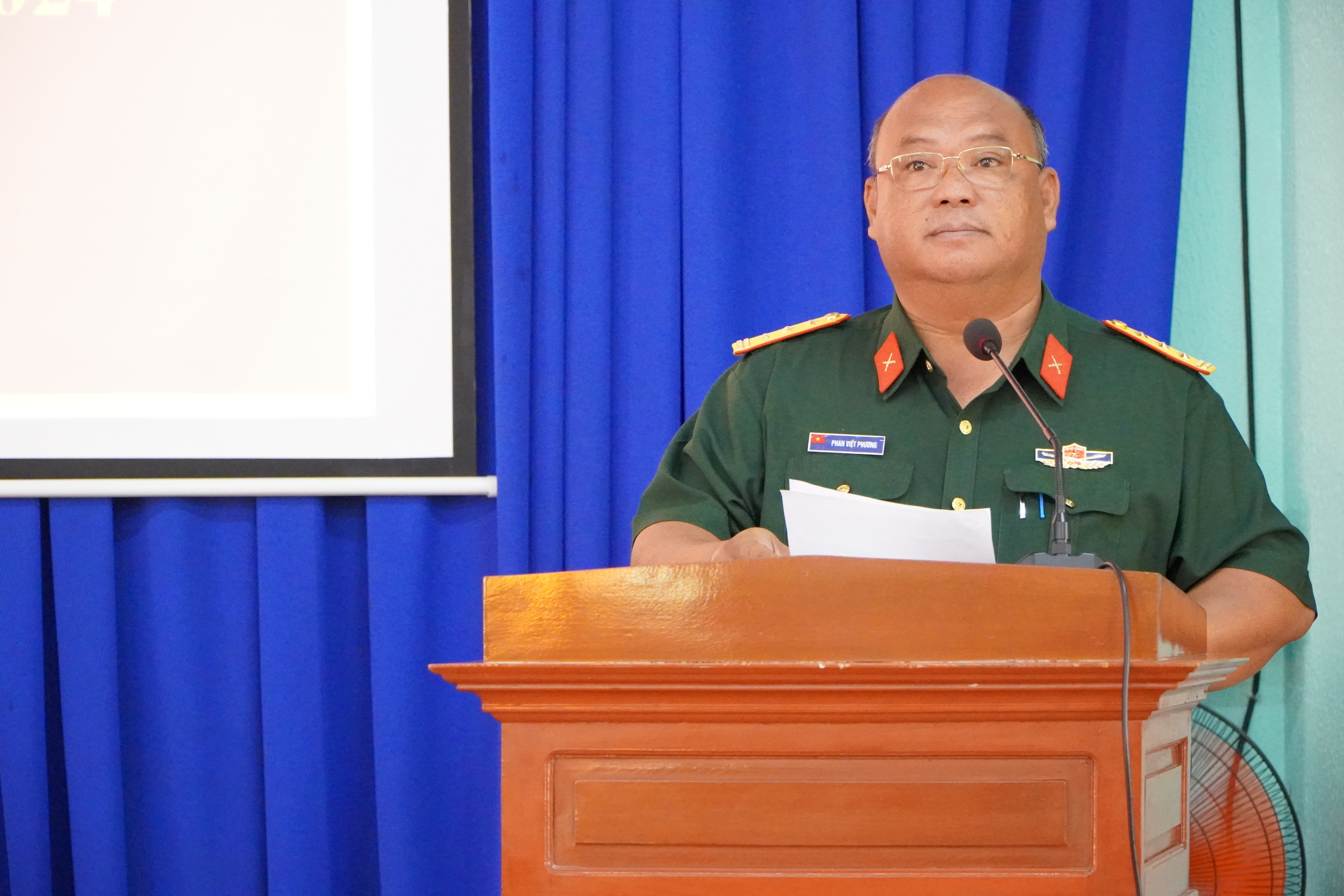 Thượng tá Phan Việt Phương, Ủy viên BTV Huyện ủy, Chỉ huy trưởng Ban CHQS huyện phát biểu khai giảng lớp bồi dưỡng