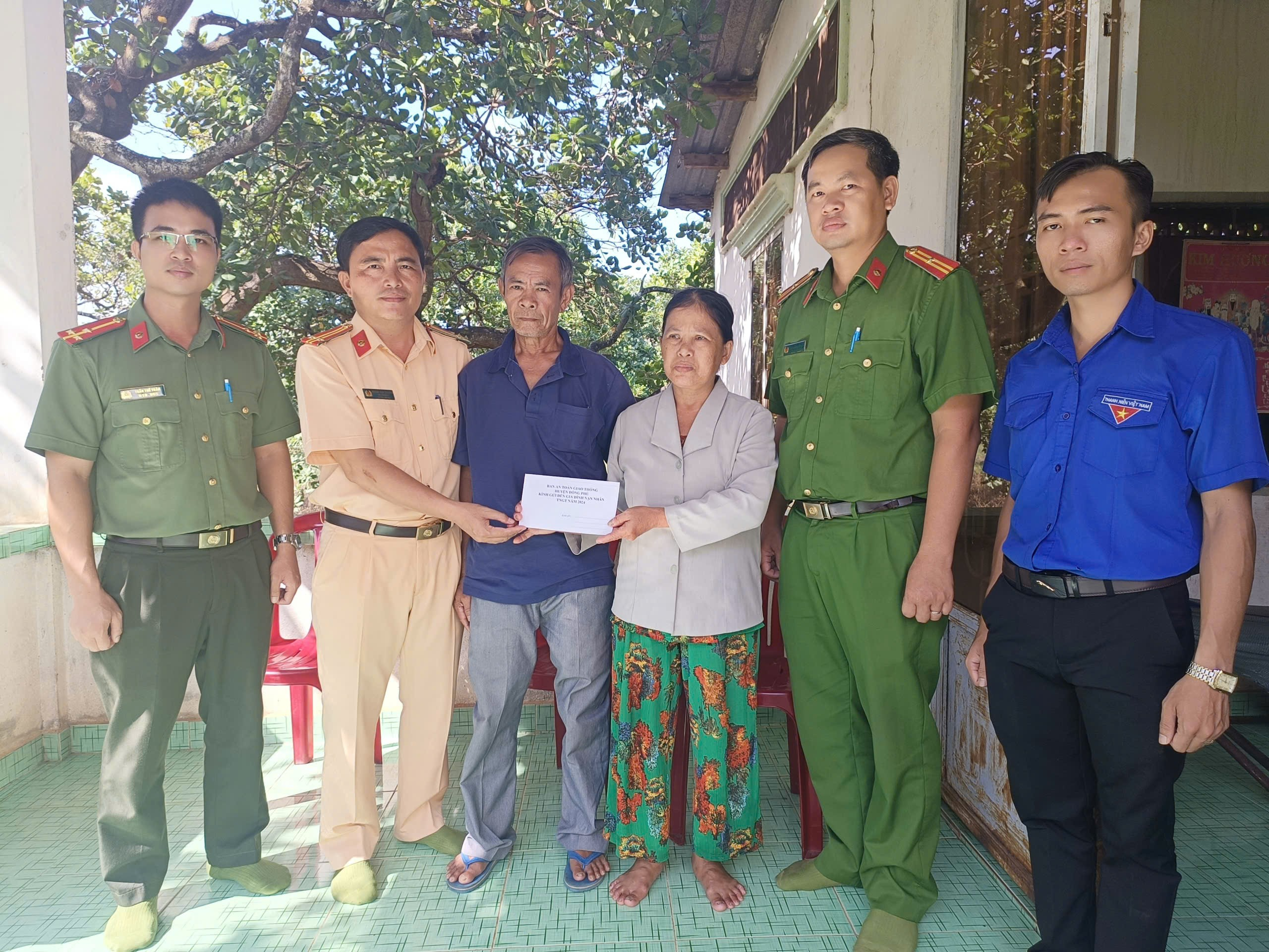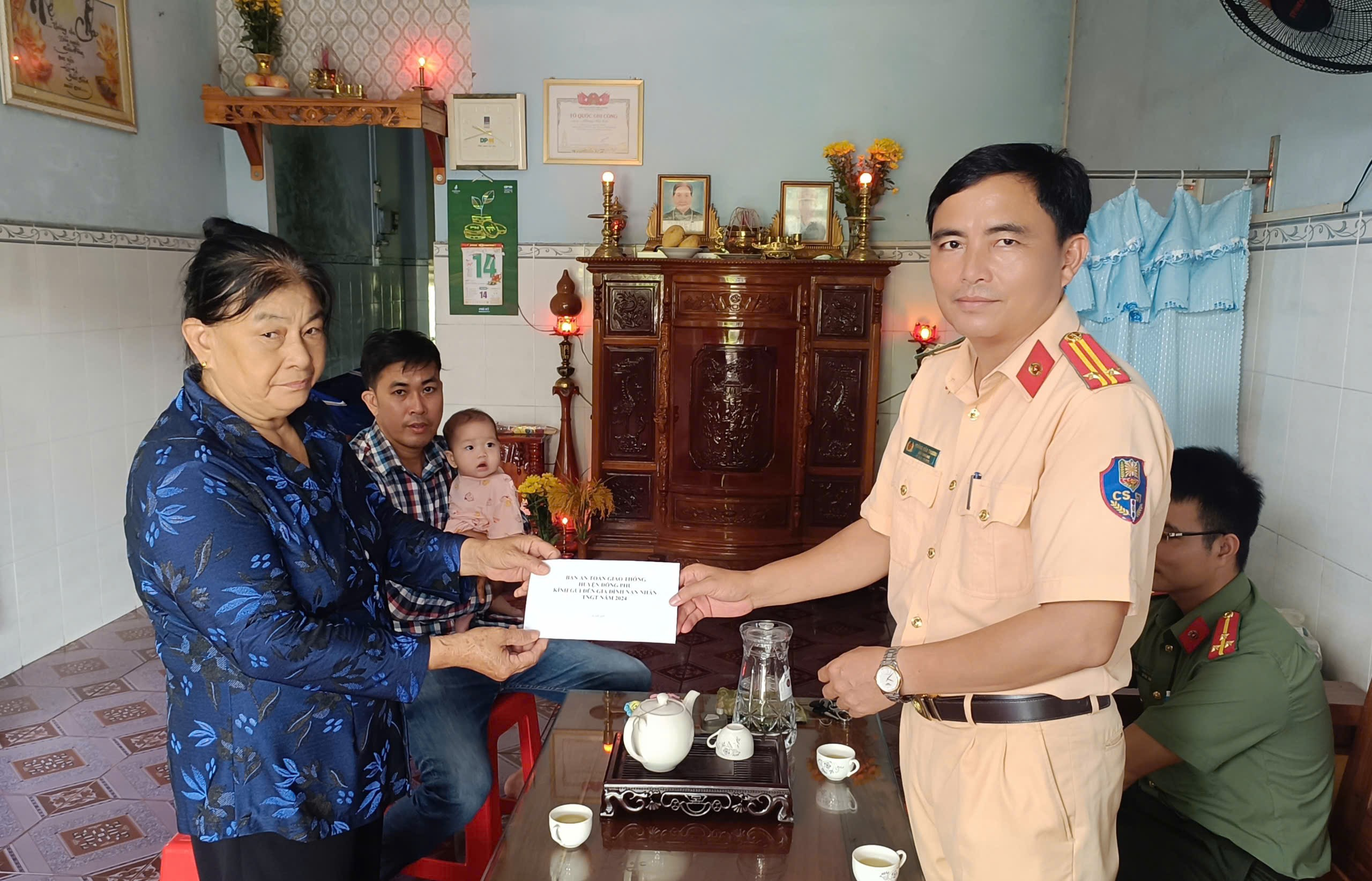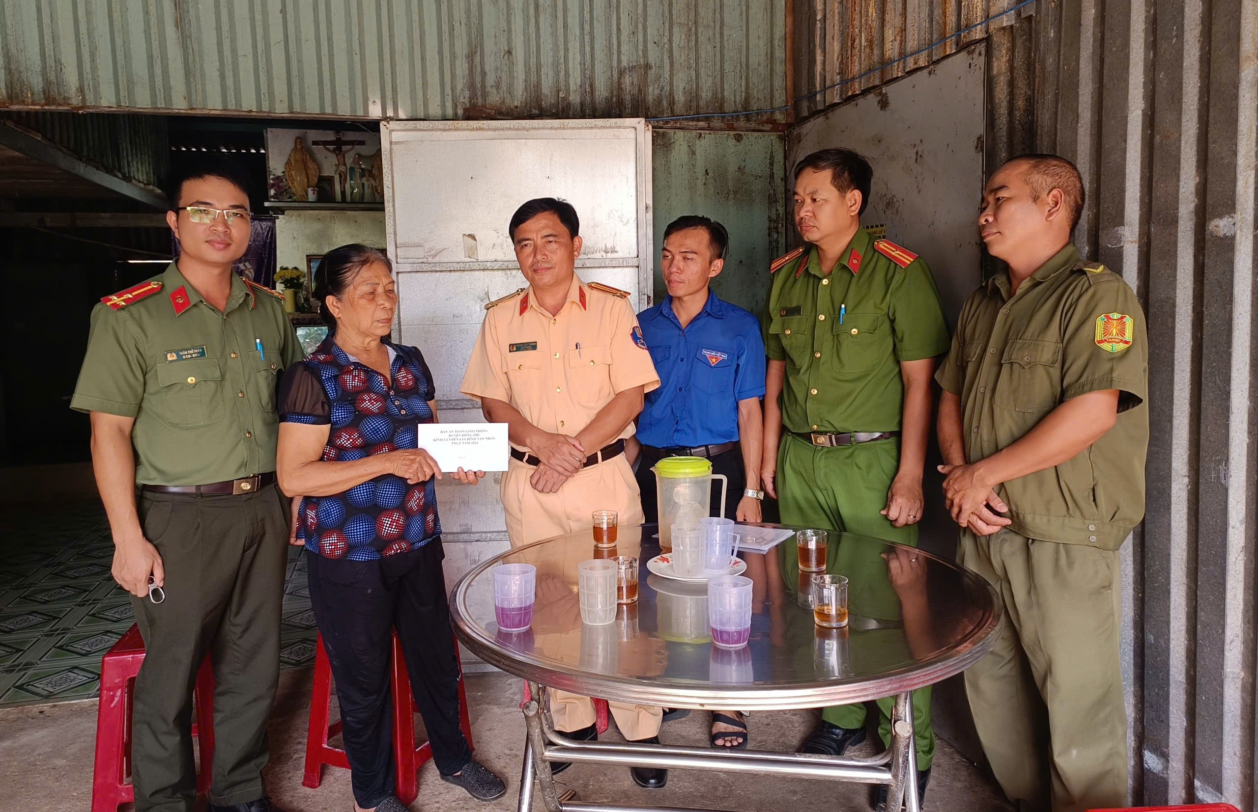Trung tá Hoàng Văn Thương, Đội trưởng Đội CSGT, Công an huyện Đồng Phú tặng quà gia đình có nạn nhân bị tai nạn giao thông