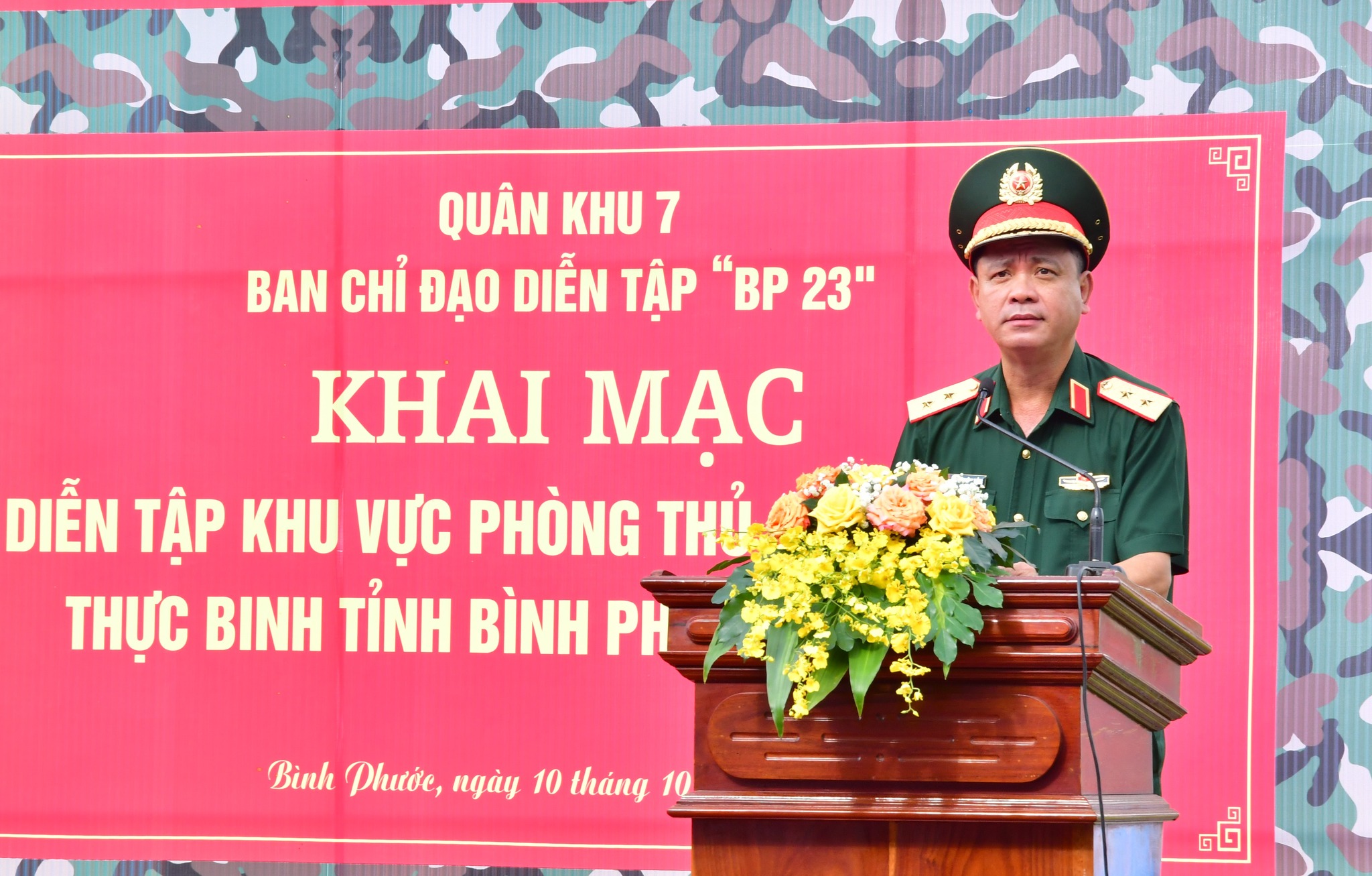 Sáng ngày 10/10, tỉnh Bình Phước tổ chức khai mạc diễn tập khu vực phòng thủ (KVPT) tỉnh có một phần thực binh năm 2023. Dự và chỉ đạo diễn tập có Trung tướng Nguyễn Trường Thắng, Ủy viên Trung ương Đảng, Ủy viên Quân ủy Trung ương, Tư lệnh Quân khu 7, Trưởng Ban chỉ đạo diễn tập Quân khu; đồng chí Nguyễn Mạnh Cường, Ủy viên Trung ương Đảng, Bí thư Tỉnh ủy Bình Phước; đồng chí Trần Tuệ Hiền, Phó Bí thư Tỉnh ủy, Chủ tịch UBND tỉnh Bình Phước; đồng chí Huỳnh Thị Hằng, Phó Bí thư thường trực Tỉnh ủy, Chủ tịch HĐND tỉnh Bình Phước; Thiếu tướng Đặng Văn Hùng, Phó Tư lệnh, Tham mưu trưởng Quân khu; lãnh đạo cơ quan Bộ Quốc phòng, Bộ Công an.