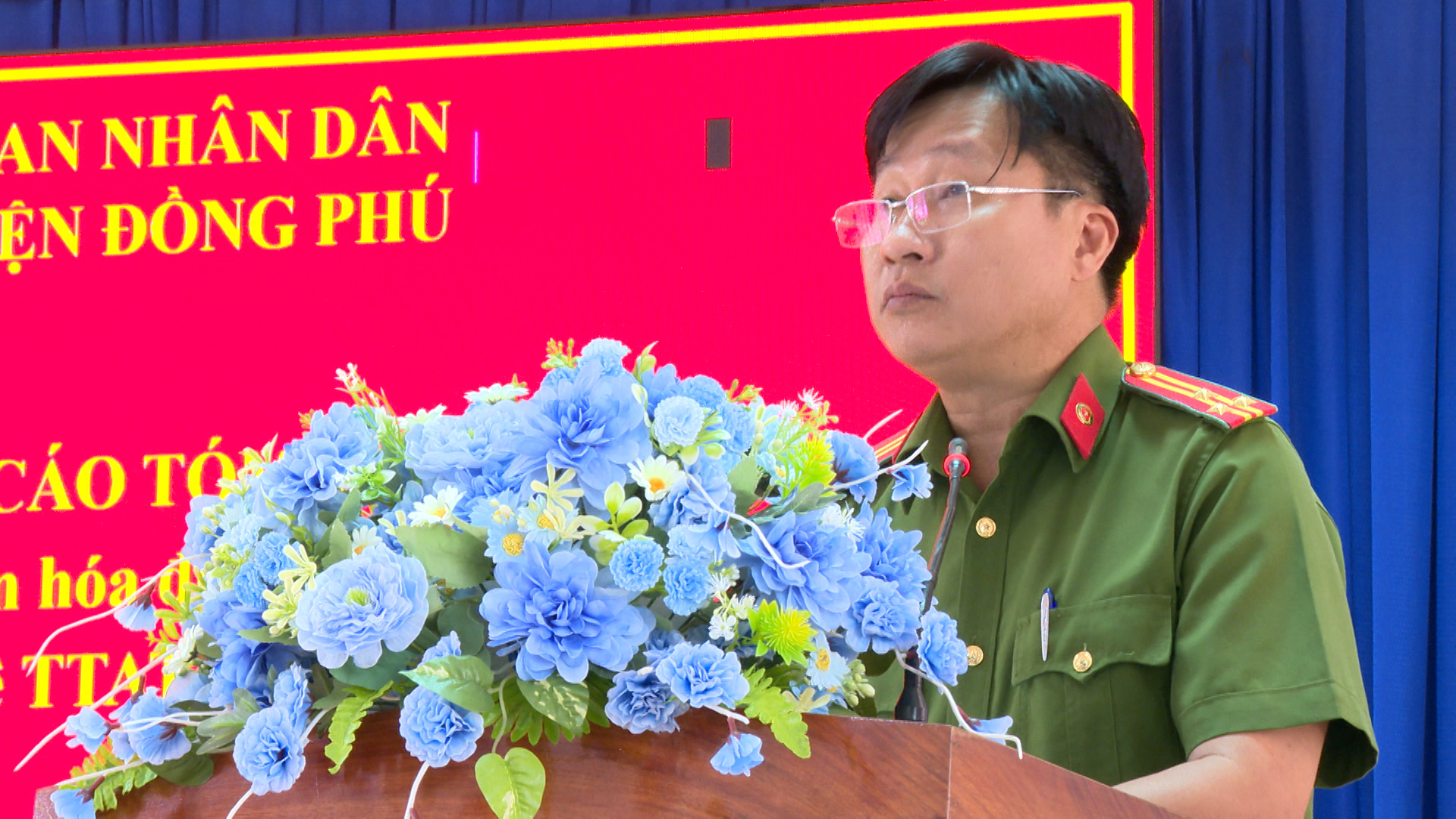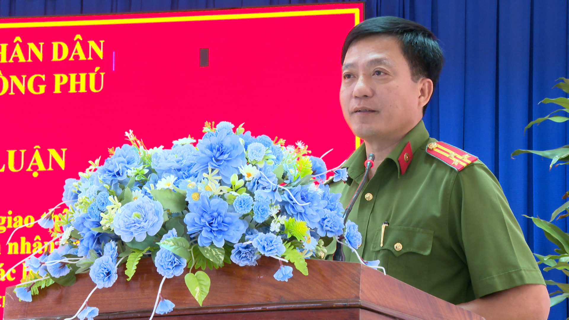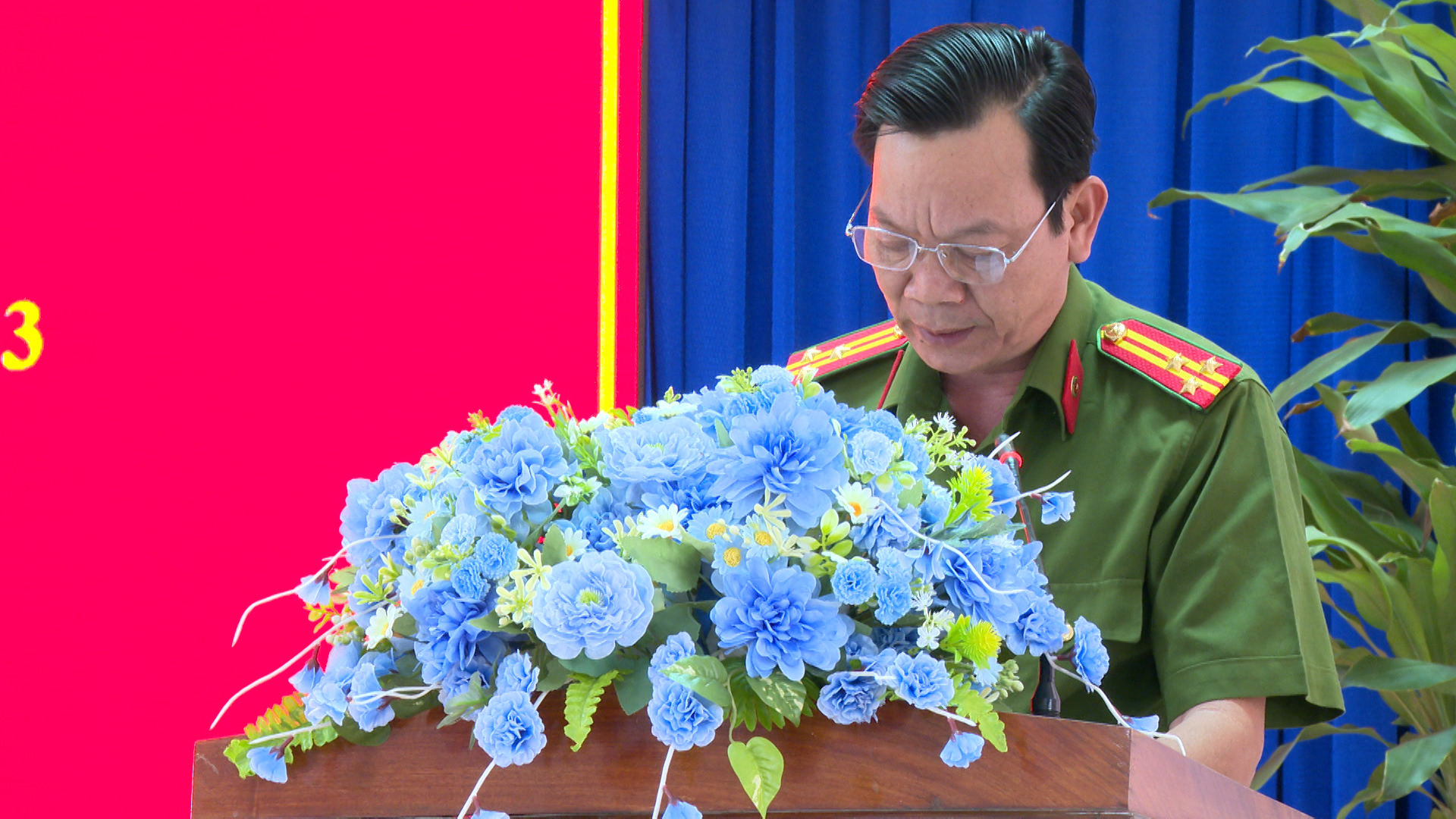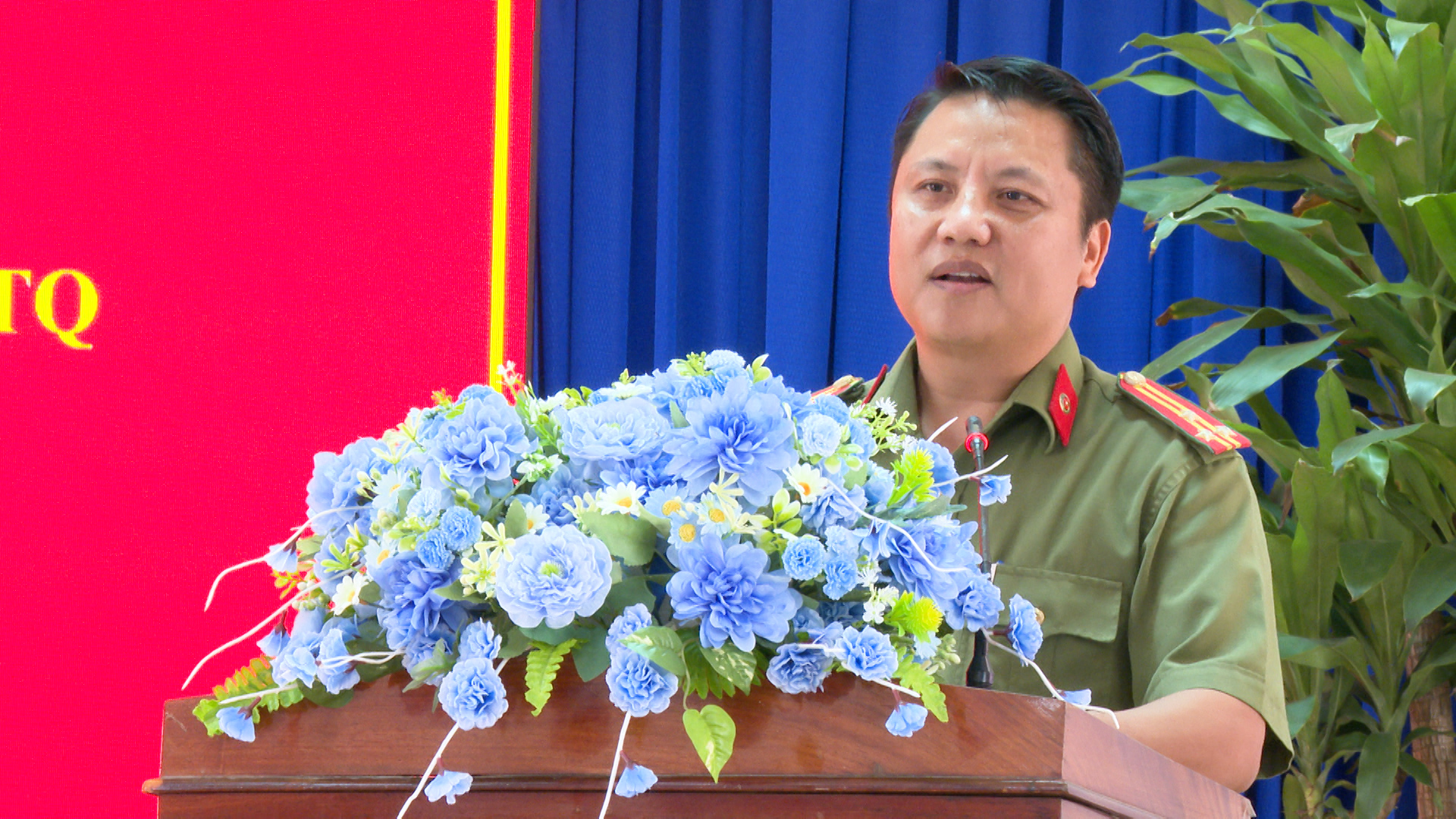 Thượng tá Nguyễn Đức Minh, uỷ viên Ban thường vụ Huyện uỷ, Trưởng Công an huyện phát biểu tại hội nghị