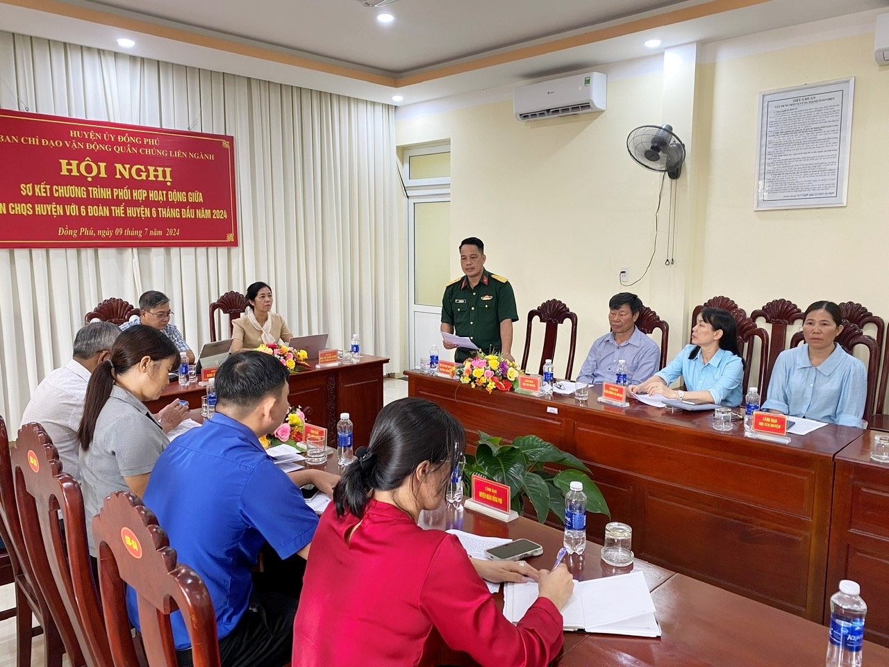 Phát biểu chỉ đạo hội nghị, Phó Bí thư Thường trực Huyện ủy, Chủ tịch HĐND huyện Đinh Văn Kỹ biểu dương tinh thần đoàn kết giữa Ban CHQS với 6 đoàn thể huyện trong thực hiện chương trình phối hợp 6 tháng đầu năm; qua đó đề nghị Ban vận động quần chúng liên ngành huyện cần phát huy kết quả đạt được, tiếp tục tăng cường phối hợp triển khai các nội dung đã ký kết, góp phần phát huy khối đại đoàn kết toàn dân tộc trong phát triển kinh tế - xã hội, củng cố QP-AN trên địa bàn.