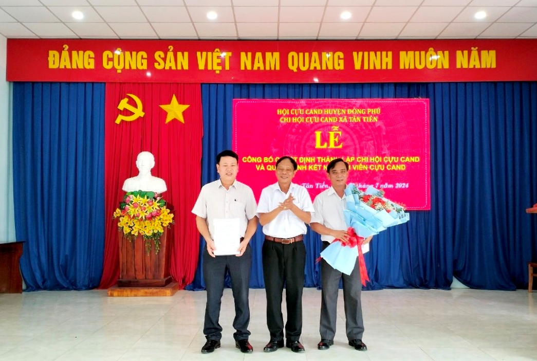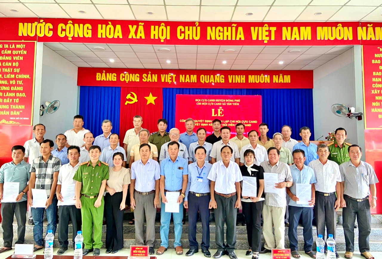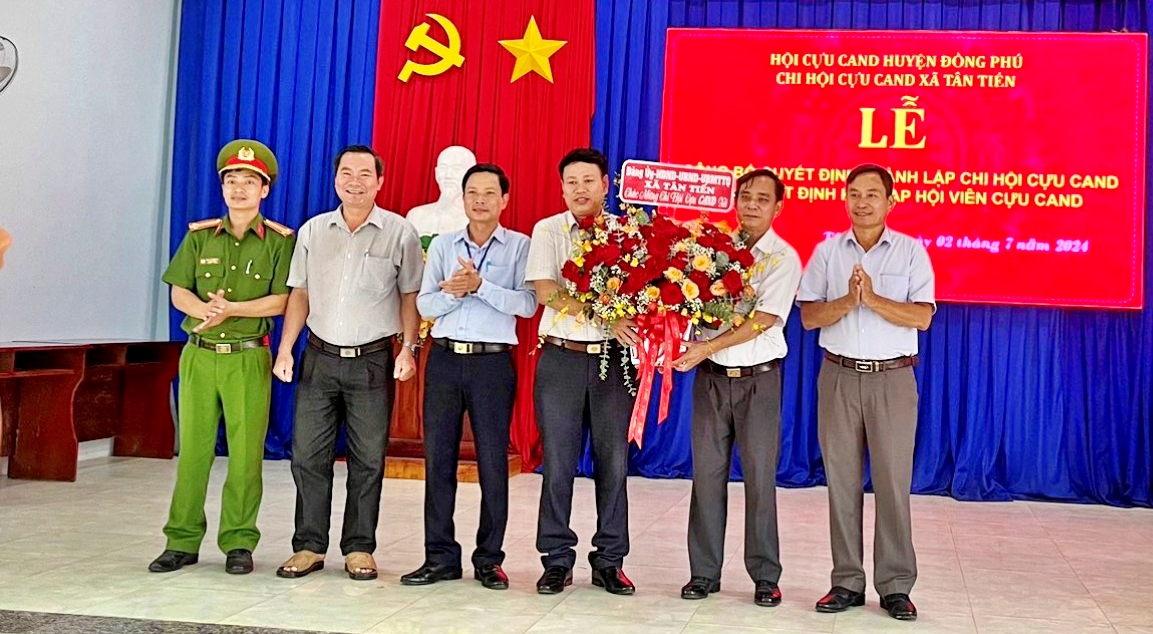 Hội cựu Công an nhân dân huyện Đồng Phú vừa tổ chức lễ công bố quyết định thành lập Chi hội cựu Công an nhân dân (CAND) xã Tân Tiến và quyết định kết nạp hội viên cựu CAND. Dự lễ có lãnh đạo Công an huyện; thường trực Đảng ủy, HĐND, UBND, UBMTTQ xã Tân Tiến.