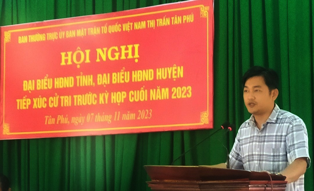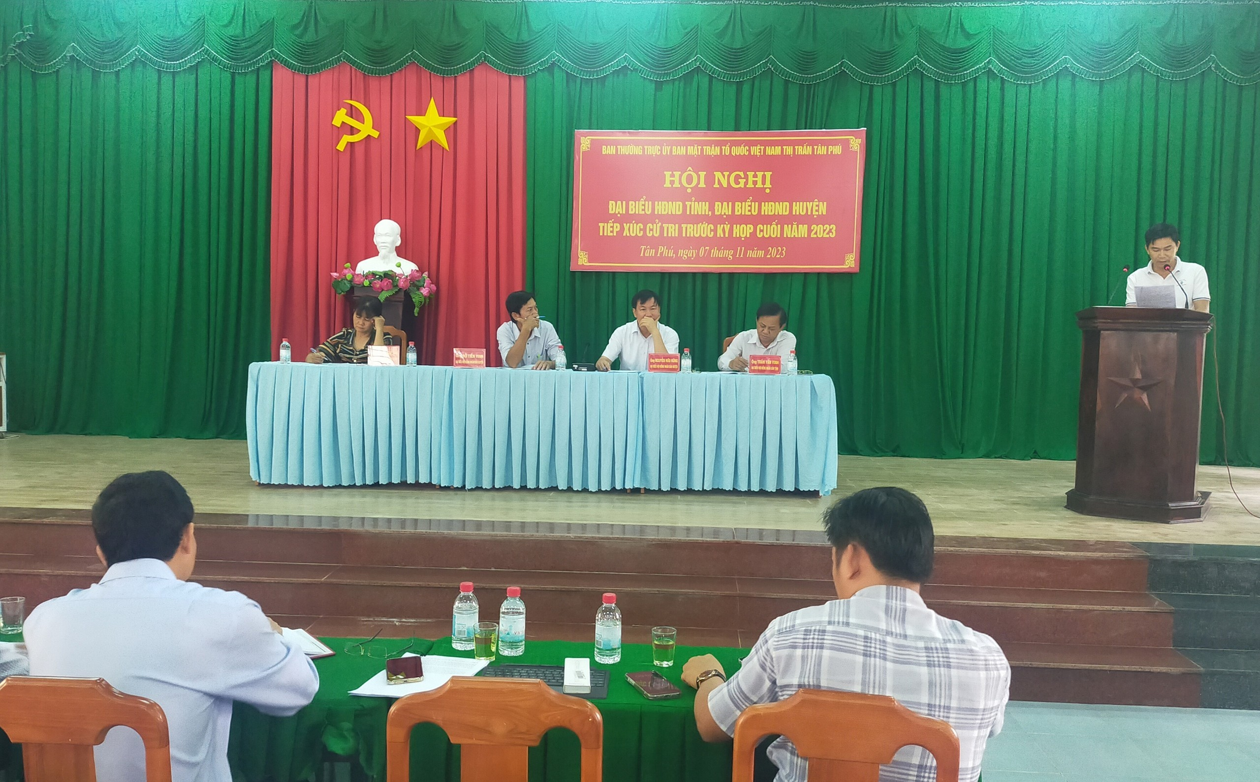 Sau khi đại biểu HĐND tỉnh, huyện thông báo kết quả kỳ họp thứ 12 HĐND tỉnh khóa X (kỳ họp chuyên đề), thông báo nội dung, chương trình và thời gian tổ chức kỳ họp cuối năm của HĐND tỉnh, HĐND huyện. Đồng thời, thông báo kế hoạch lấy phiếu tín nhiệm đối với người giữ chức vụ do HĐND tỉnh, HĐND huyện bầu. Cử tri thị trấn Tân Phú đã tham gia nhiều ý kiến, với các nội dung: Tuyến đường ngang đi qua tổ 50, 52, 54, 56, khu phố Bàu Ké bị san lấp, chế độ đối với người động không chuyên trách cấp xã và thôn, ấp không hợp lý; công tác giải tỏa, đền bù không thỏa đáng, đường Nguyễn Hữu Thọ đã giải phóng mặt bằng nhưng chưa thi công, công tác khám bệnh bằng BHYT còn bất cập, tình trạng thiếu thuốc tại các cơ sở y tế thường xuyên xảy ra,…
