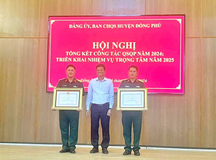 Dịp này, UBND huyện Đồng Phú đã tặng giấy khen cho 5 tập thể, 10 cá nhân có thành tích trong phong trào thi đua quyết thắng; Ban CHQS huyện tặng danh hiệu chiến sĩ thi đua cơ sở cho 2 cá nhân, tặng danh hiệu chiến sĩ tiên tiến cho 1 cá nhân và tặng giấy khen cho 3 tập thể, 5 cá nhân có thành tích trong phong trào thi đua quyết thắng năm 2024.