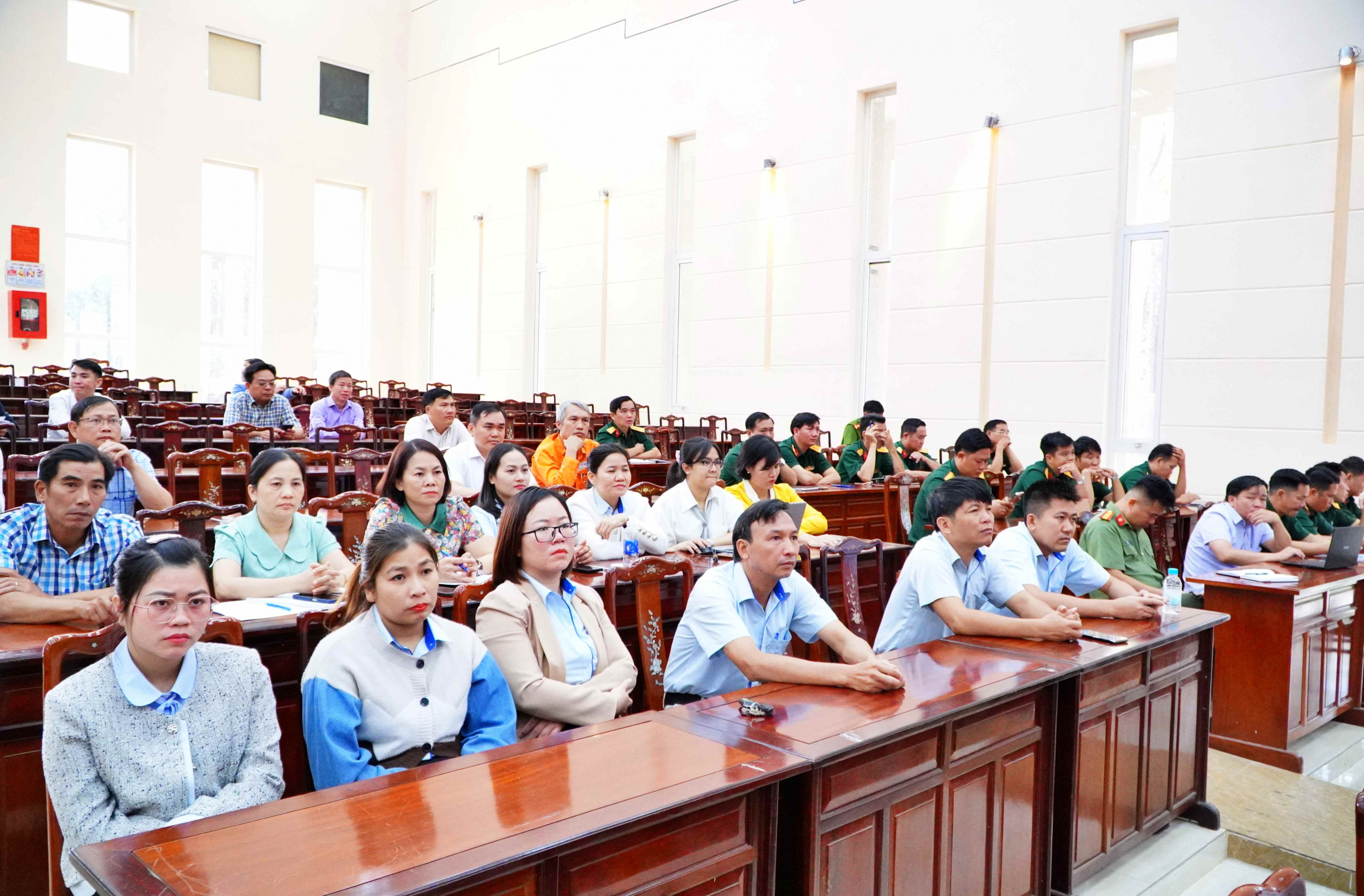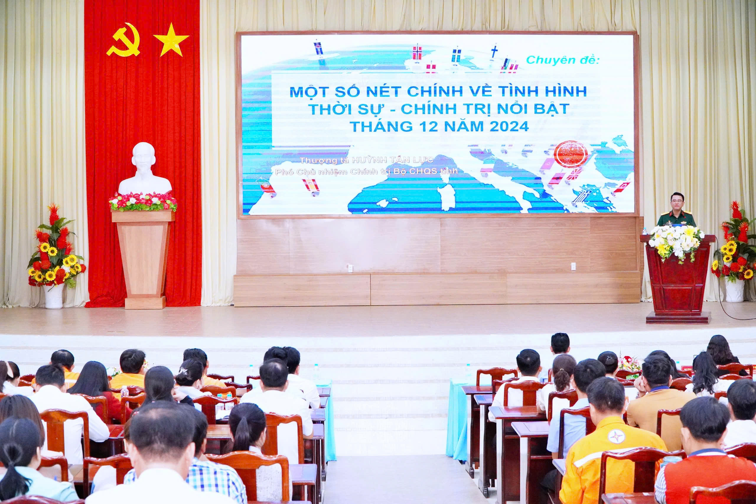Hội nghị được Thượng tá Huỳnh Tấn Lực, Phó chủ nhiệm chính trị, Bộ chỉ huy quân sự tỉnh Bình Phước thông tin các nội dung liên quan đến: Một số thách thức và giải pháp trong hợp tác đường sắt Việt - Trung; Cuộc chiến Israel - Hamas một năm nhìn lại; Nguy cơ căng thẳng hạt nhân sau những động thái của Nga và Mỹ; Tổng hợp tình hình thời sự, chính trị nổi bật tháng 12/2024.