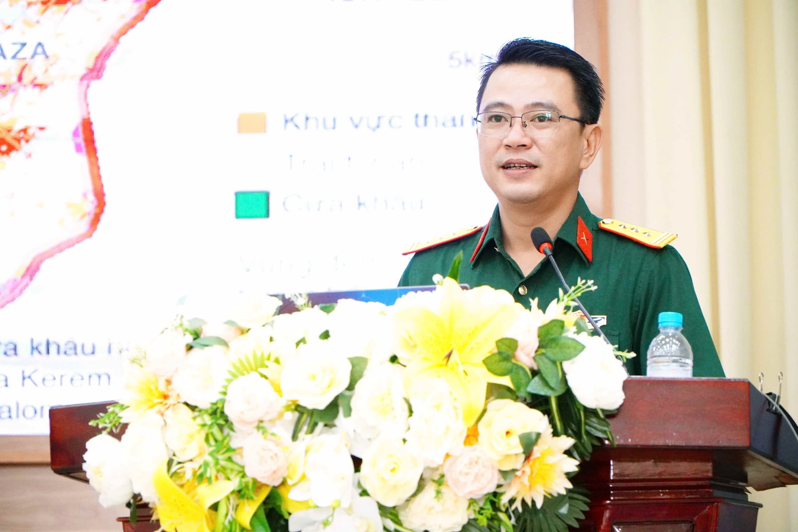 Thượng tá Huỳnh Tấn Lực, Phó chủ nhiệm chính trị, Bộ CHQS tỉnh thông tin các chuyên đề đến hội nghị