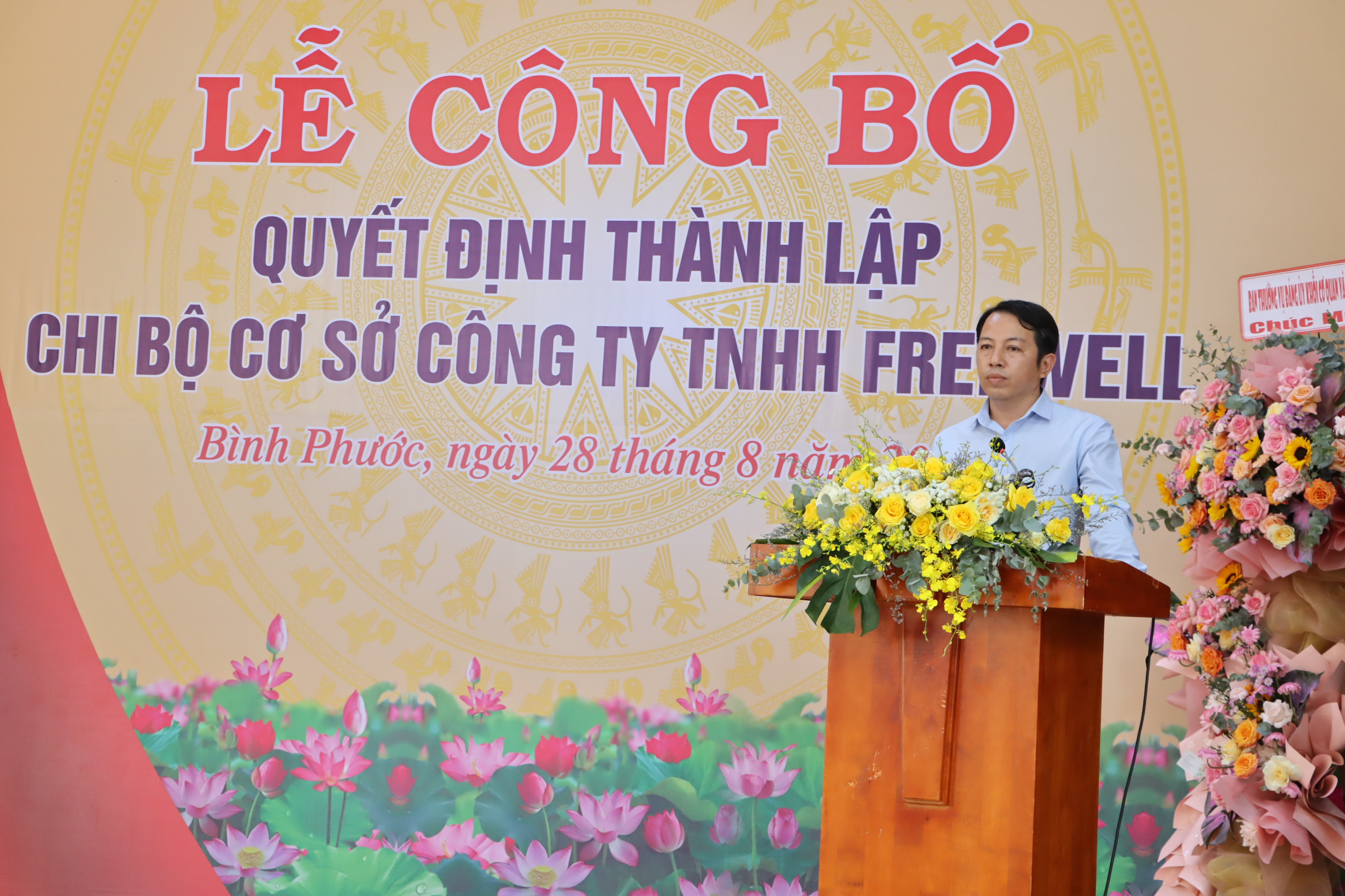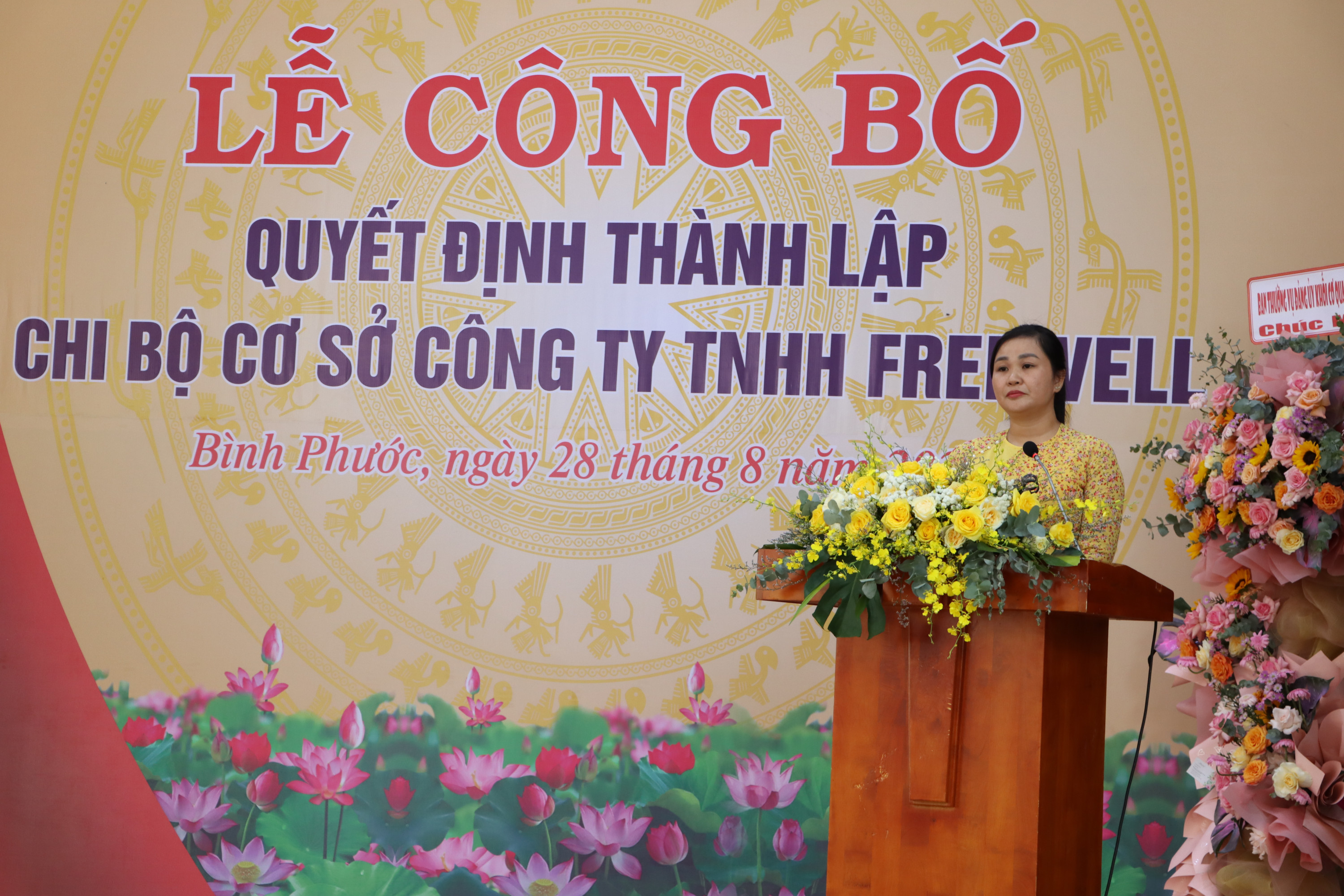 Tại buổi lễ, đại diện ban tổ chức công bố quyết định thành lập Chi bộ cơ sở Công ty TNHH Freewell gồm 9 đảng viên; chỉ định đảng viên Lương Thị Trang giữ chức Bí thư chi bộ, nhiệm kỳ 2020-2025.