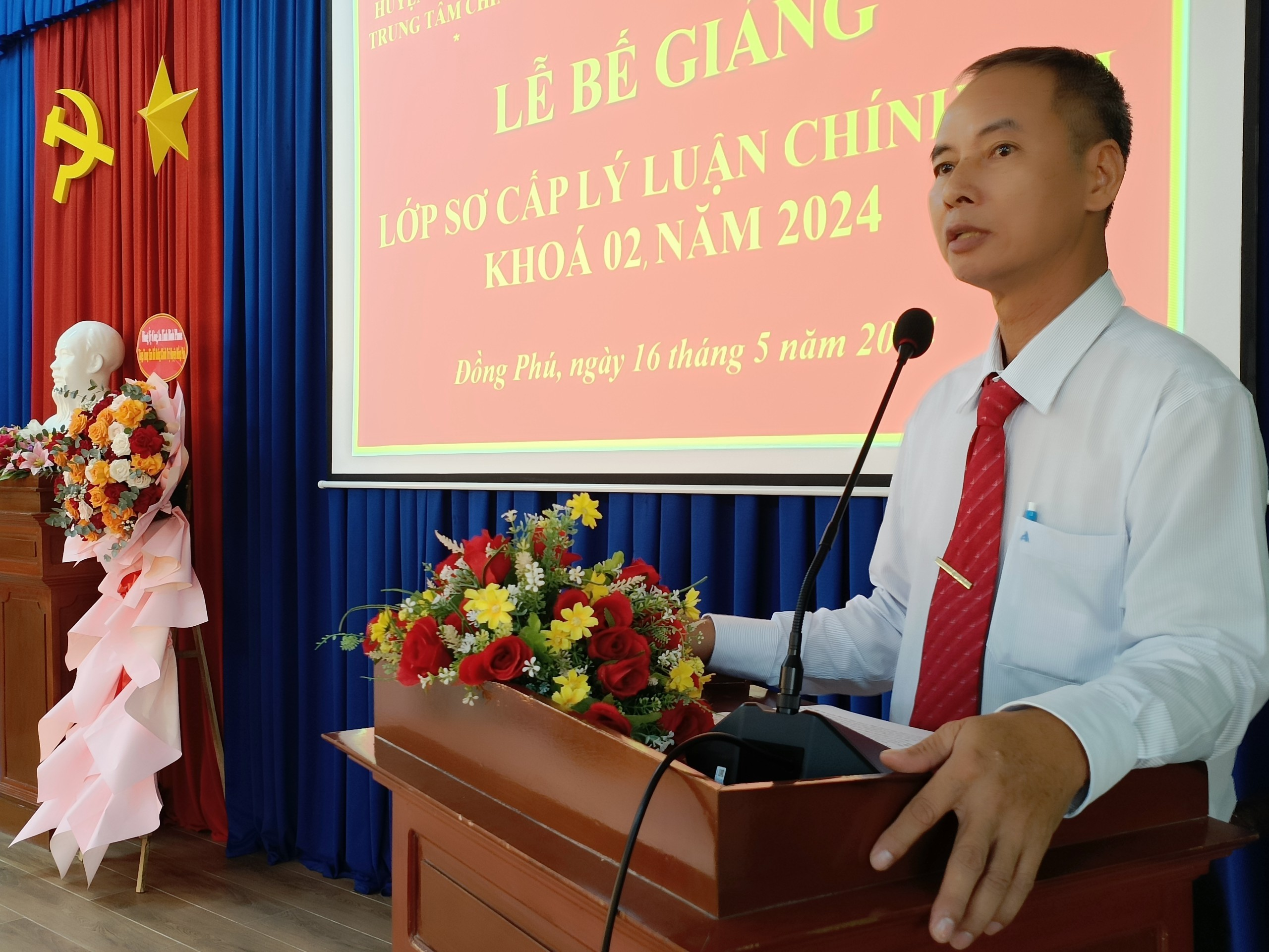 Sáng 16-5-2024, Trung tâm chính trị huyện Đồng Phú đã tổ chức lễ bế giảng Lớp Sơ cấp lý luận chính trị khoá 02/2024. Tham dự buổi lễ có UVBTV, Trưởng Ban tuyên giáo Huyện ủy, Giám đốc Trung tâm chính trị huyện Nguyễn Văn Tặng, lãnh đạo Công an tỉnh, Ban tổ chức, UBKT, Văn phòng Huyện ủy và 100 học viên là cán bộ đang công tác và làm việc tại Công an tỉnh, công an thành phố Đồng Xoài và công an huyện Đồng Phú.