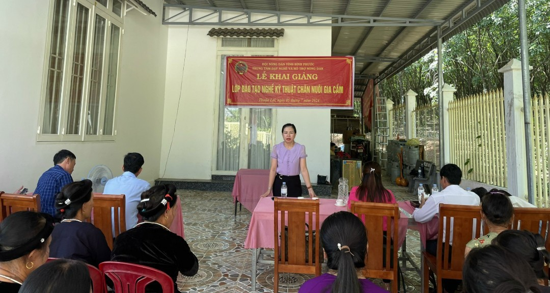 Chiều ngày 5-7-2024, tại gia đình bà Nông Thị Ranh, ấp Thuận Tân, xã Thuận Lợi, Trung tâm Dạy nghề và Hỗ trợ nông dân tỉnh Bình Phước đã khai giảng lớp Kỹ thuật chăn nuôi gia cầm. Bà Lê Thị Thu Hương - Giám đốc Trung tâm dự và phát biểu tại buổi lễ.