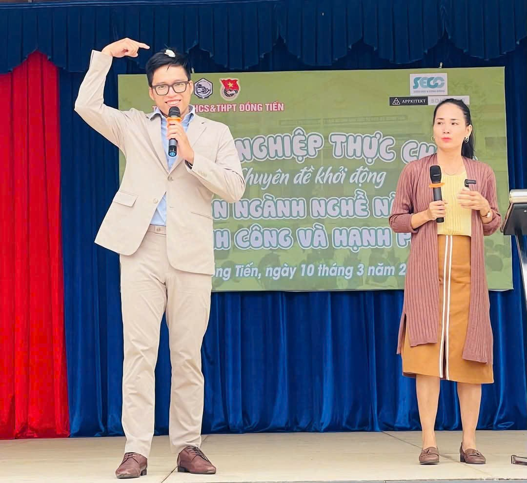 Buổi nói chuyện chuyên đề “Chọn ngành nghề nào để thành công và hạnh phúc” thuộc dự án Hướng nghiệp thực chiến do Công ty TNHH Giáo dục kỹ năng và truyền thông cộng đồng (SECC) tổ chức vừa diễn ra tại trường THCs-THPt Đồng Tiến  đã thu hút sự tham gia của Ban Giám Hiệu nhà trường, các thầy cô giáo và 920 em học sinh.