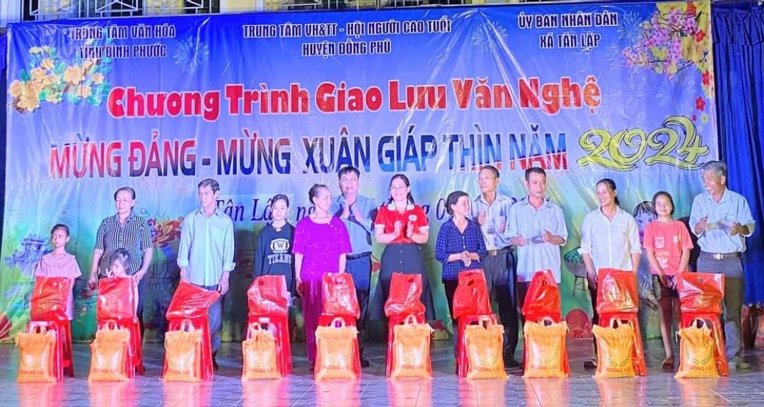 Nhân dịp này, Hội chữ thập đỏ huyện Đồng Phú đã kết nối Đài Phát thanh - Truyền hình và Báo Bình Phước, Công an tỉnh vận động Phòng khám đa khoa Tâm Đức (thành phố Đồng Xoài) tặng 30 phần quà, mỗi phần bao gồm các nhu yếu phẩm, như: Gạo, mỳ tôm, nước tương, bột ngọt, … trị giá 500 ngàn đồng, cho đối tượng bảo trợ xã hội trên địa bàn xã Tân Lập.