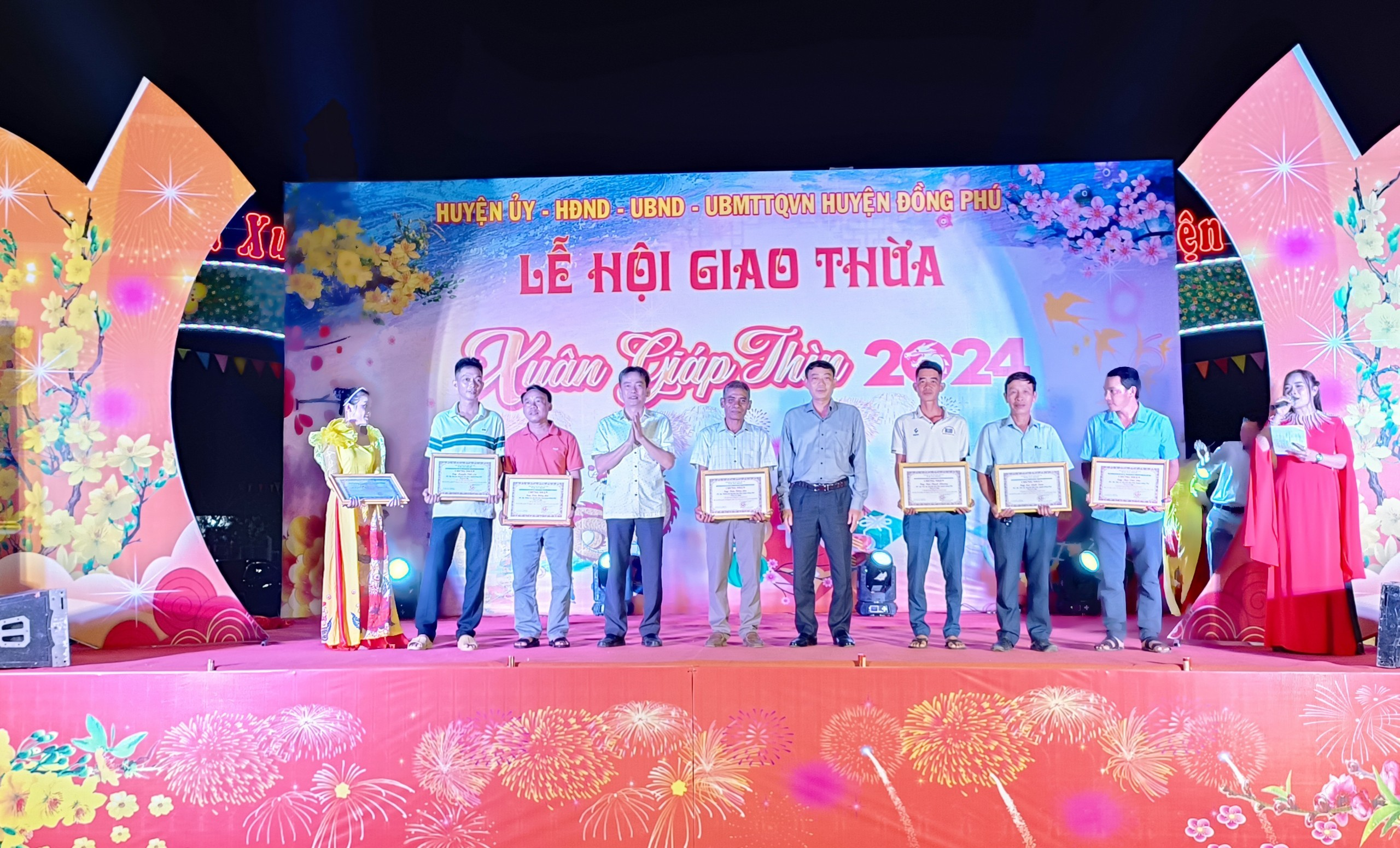 Trước khi diễn ra chương trình nghệ thuật, huyện Đồng Phú đã tổng kết, khen thưởng và trao giải cho những tập thể, cá nhân có gian hàng trưng bày, trang trí đẹp và cây mai, cây kiểng đẹp tại hội chợ Hoa Xuân Giáp Thìn 2024.