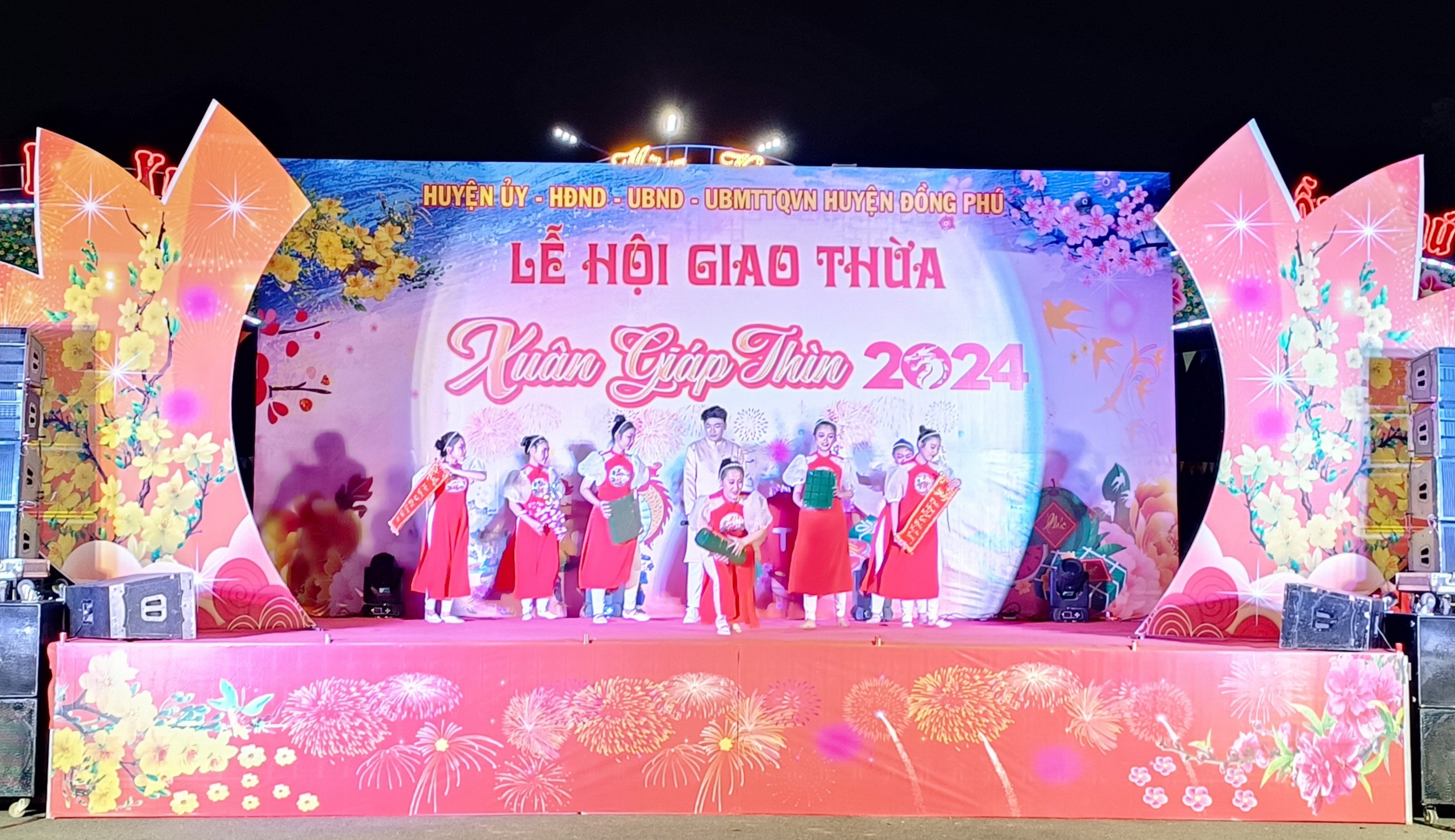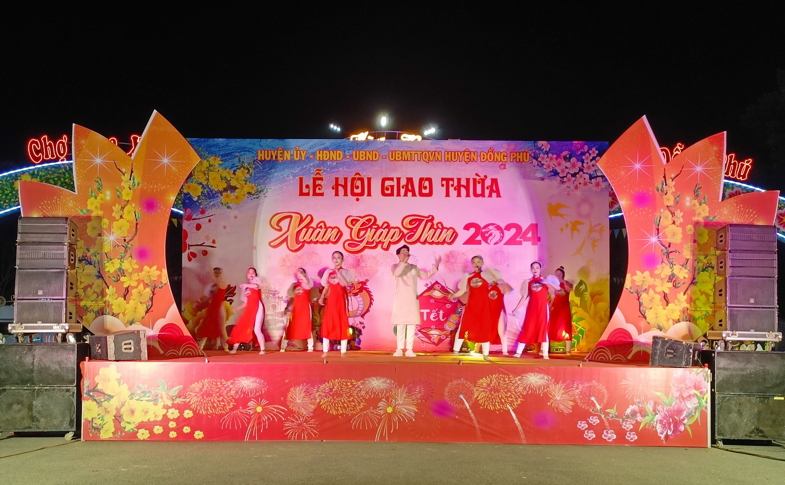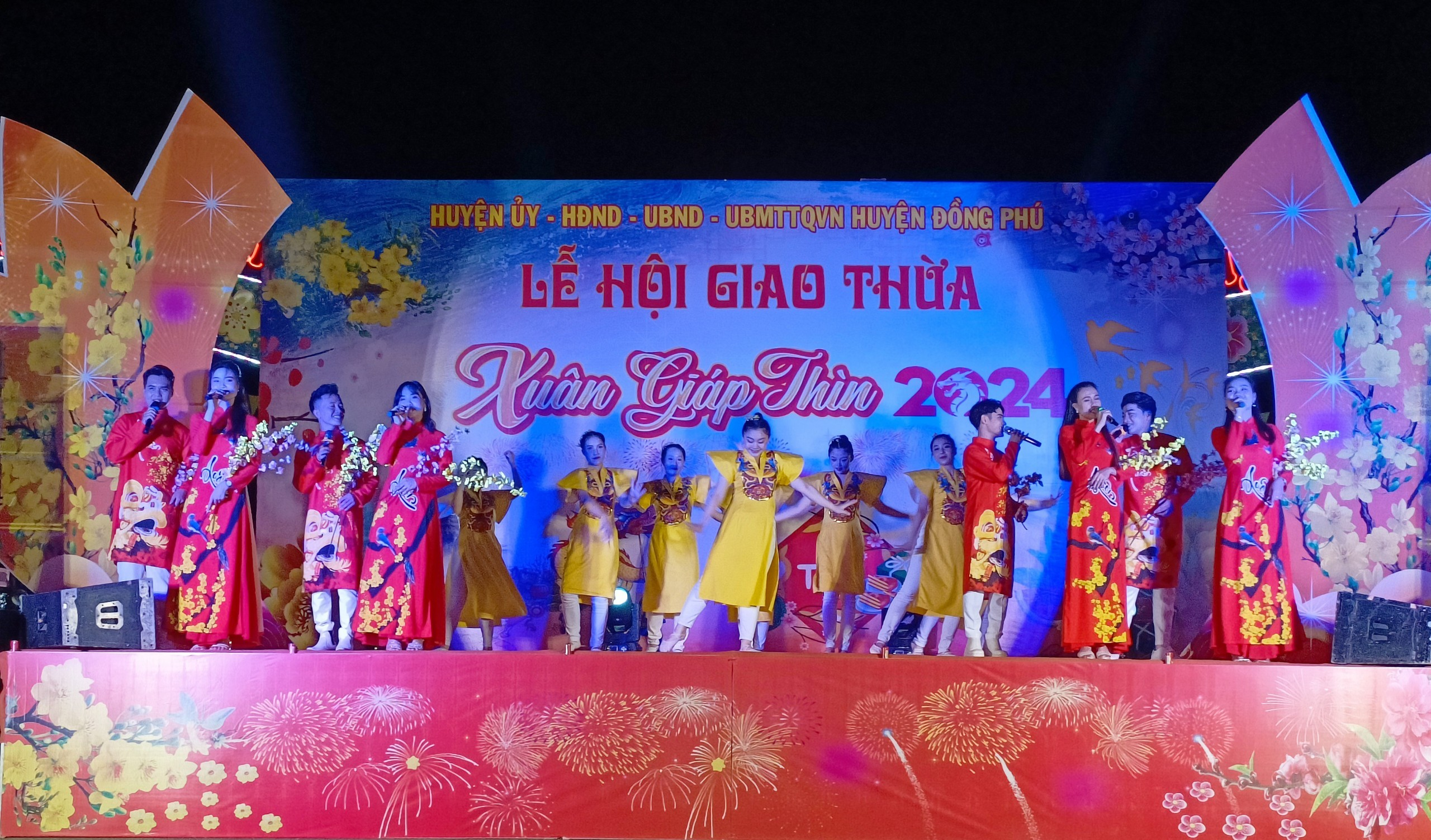 Chương trình nghệ thuật Đêm giao thừa Xuân Giáp Thìn 2024 do Trung tâm văn hóa và thể thao huyện Đồng Phú tổ chức. Với các ca khúc ca ngợi Đảng, Bác Hồ, tình yêu quê hương đất nước, ca ngợi mùa xuân, … được các nghệ sỹ, ca sỹ hàng đầu của tỉnh Bình Phước biểu diễn đã mang đến không gian rộn ràng sắc xuân với nhiều dư vị cảm xúc. Mỗi nốt nhạc, giai điệu như thôi thúc khán giả hoà nhịp đắm say trong bữa tiệc tất niên chào đón Xuân mới với niềm tin và hy vọng mới.