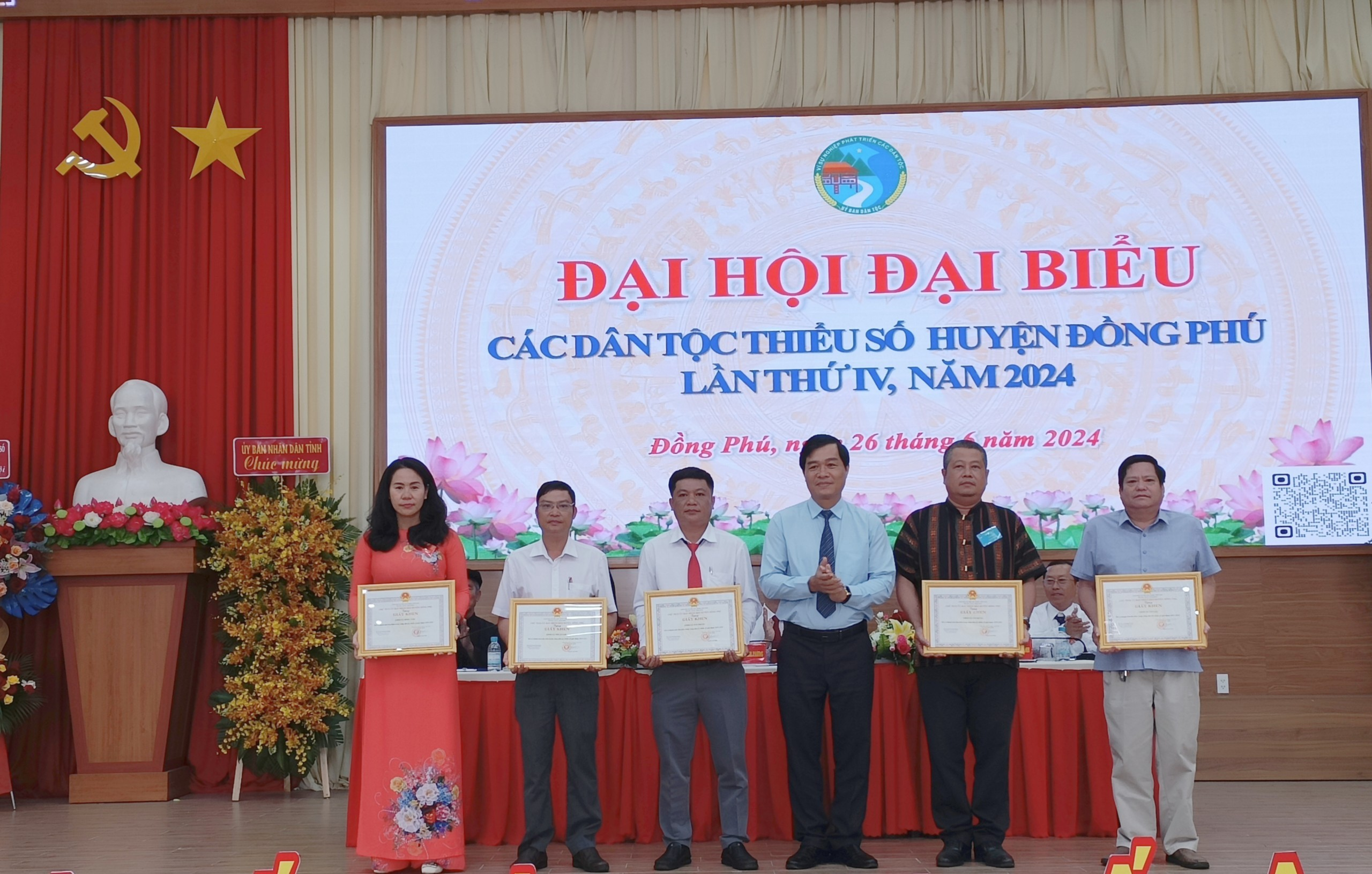 Dịp này, Ban Dân tộc tỉnh tặng giấy khen cho 2 tập thể, 4 cá nhân, UBND huyện tặng giấy khen cho 5 tập thể, 10 cá nhân có thành tích xuất sắc trong công tác dân tộc giai đoạn 2019-2024.