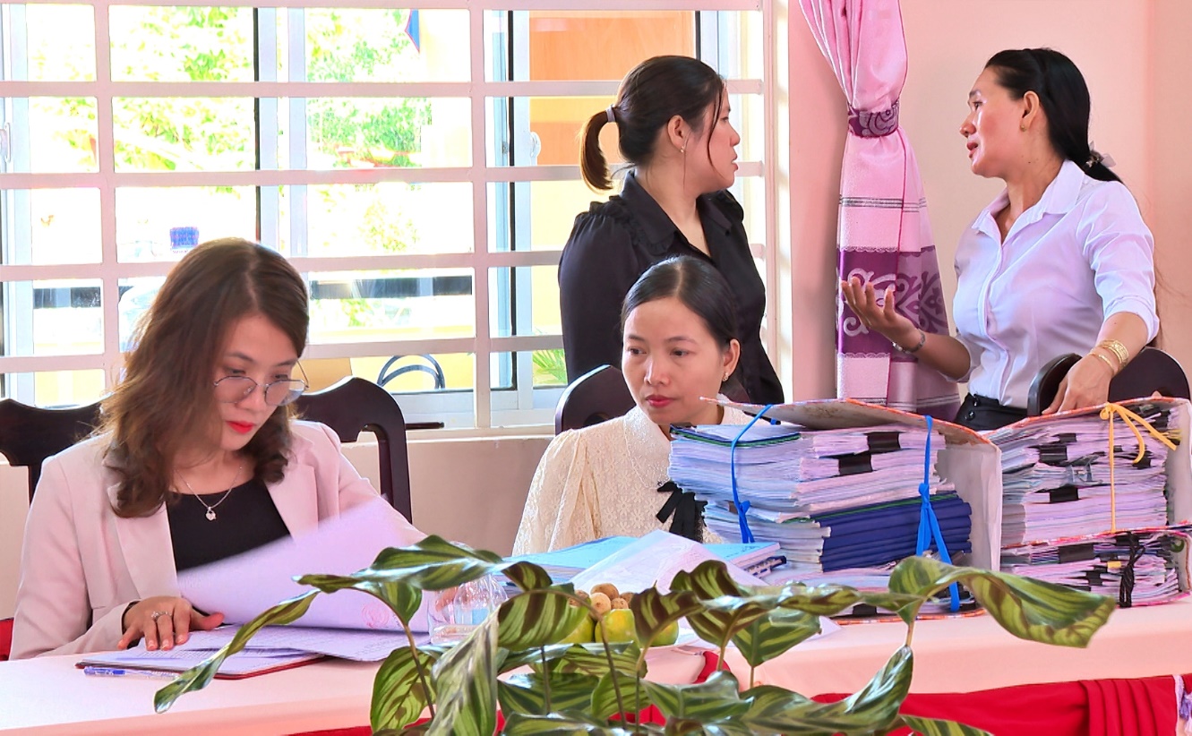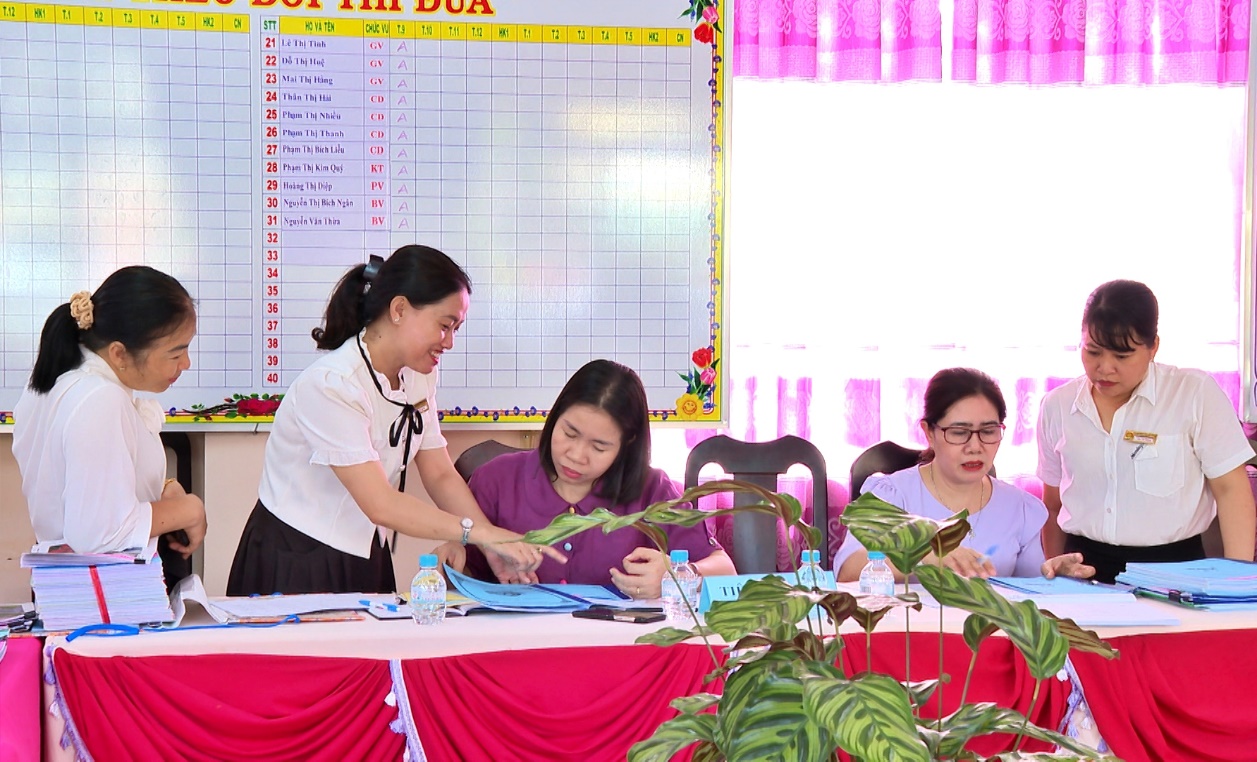 Các thành viên đoàn kiểm tra hồ sơ minh chứng của Trường mầm non Tân Phước
