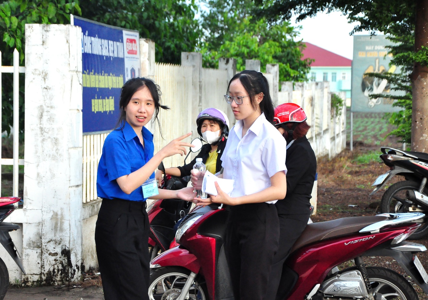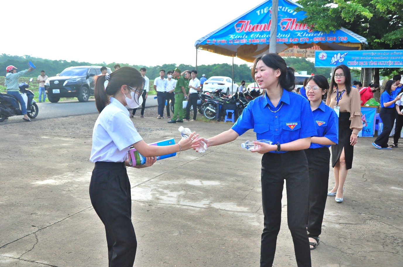 Tại điểm thi trường THPT Đồng Phú, đồng hành cùng các sĩ tử có lực lượng tình nguyện viên hết sức nhiệt tình, với những chai nước cùng những lời động viên, chúc các thí sinh tự tin vượt vũ môn, hoàn thành được ước mơ của mình.