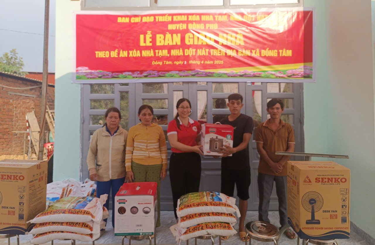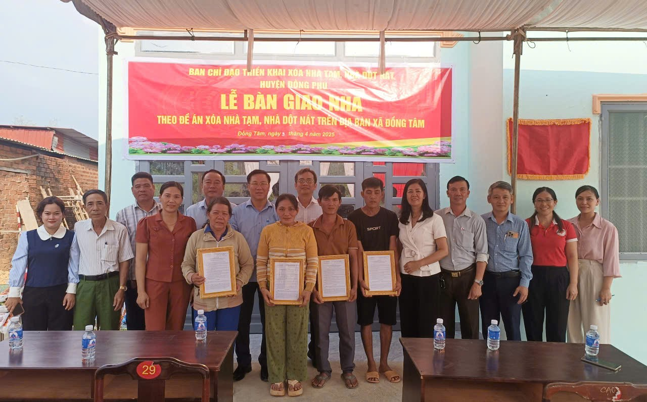 Chiều 9-4-2025, Ban chỉ đạo triển khai xóa nhà tạm, nhà dột nát huyện Đồng Phú đã tổ chức lễ bàn giao 5 căn nhà tại xã Thuận Phú và Đồng Tâm.Tham dự buổi lễ có Phó chủ tịch UBND huyện Nguyễn Thanh Phương; UVBTV, Trưởng Ban Tuyên giáo và Dân vận huyện ủy Ngô Thị Thanh Chung; UVBTV, Chủ tịch Ủy ban MTTQ Việt Nam huyện Nguyễn Hữu Hùng, đại diện các ban, ngành, đoàn thể huyện và lãnh đạo 2 xã Thuận Phú và Đồng Tâm