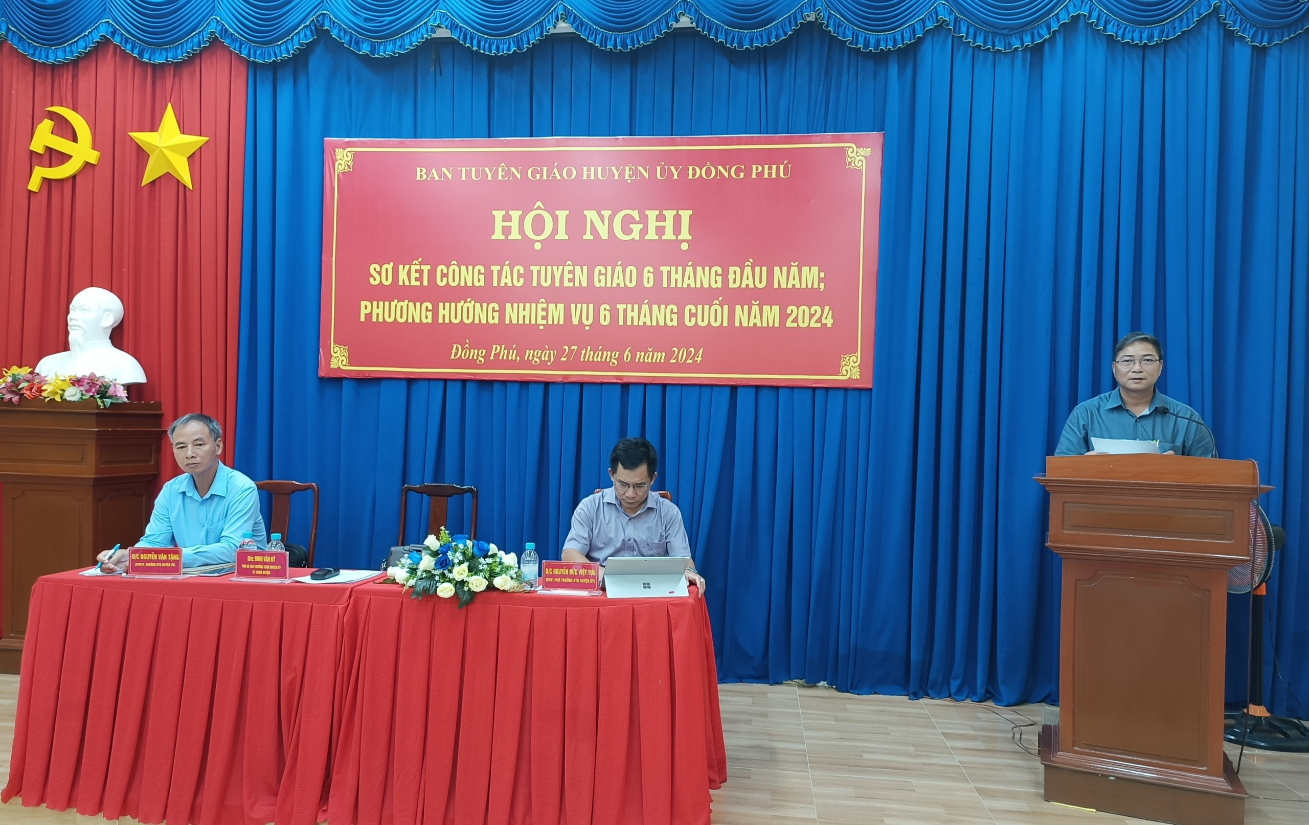 Phát biểu chỉ đạo, Phó Bí thư thường trực Huyện ủy, Chủ tịch HĐND huyện Đinh Văn Kỹ đã đánh giá cao những kết quả đã đạt trong 6 tháng đầu năm 2024. Thời gian tới, Ban tuyên giáo Huyện ủy Đồng Phú tiếp tục đa dang hóa các hình thức tuyên truyền các Chỉ thị, Nghị quyết các cấp vào cuộc sống; tăng cường quảng bá hình ảnh, văn hóa, con người Đồng Phú; tiếp tục thực hiện Chỉ thị 05-CT/TW ngày 15/5/2016 của Bộ Chính trị, đẩy mạnh thực hiện Sổ tay đảng viên điện tử. Đồng thời, chủ động nắm bắt tình hình, xử lý các vấn đề phát sinh trên địa bàn, thực hiện tốt công tác tham mưu cho Ban Chỉ đạo 35 theo dõi, nắm bắt tình hình, định hướng và chỉ đạo giải quyết kịp thời những vấn đề liên quan đến chính trị tư tưởng trên địa bàn huyện; nâng cao chất lượng hoạt động của trang fanpage “Đồng Phú ngày mới”; hướng dẫn các xã, thị trấn tăng cường hoạt động của fanpage, trang facebook cộng đồng, góp phần thực hiện tốt công tác truyền tại địa phương….