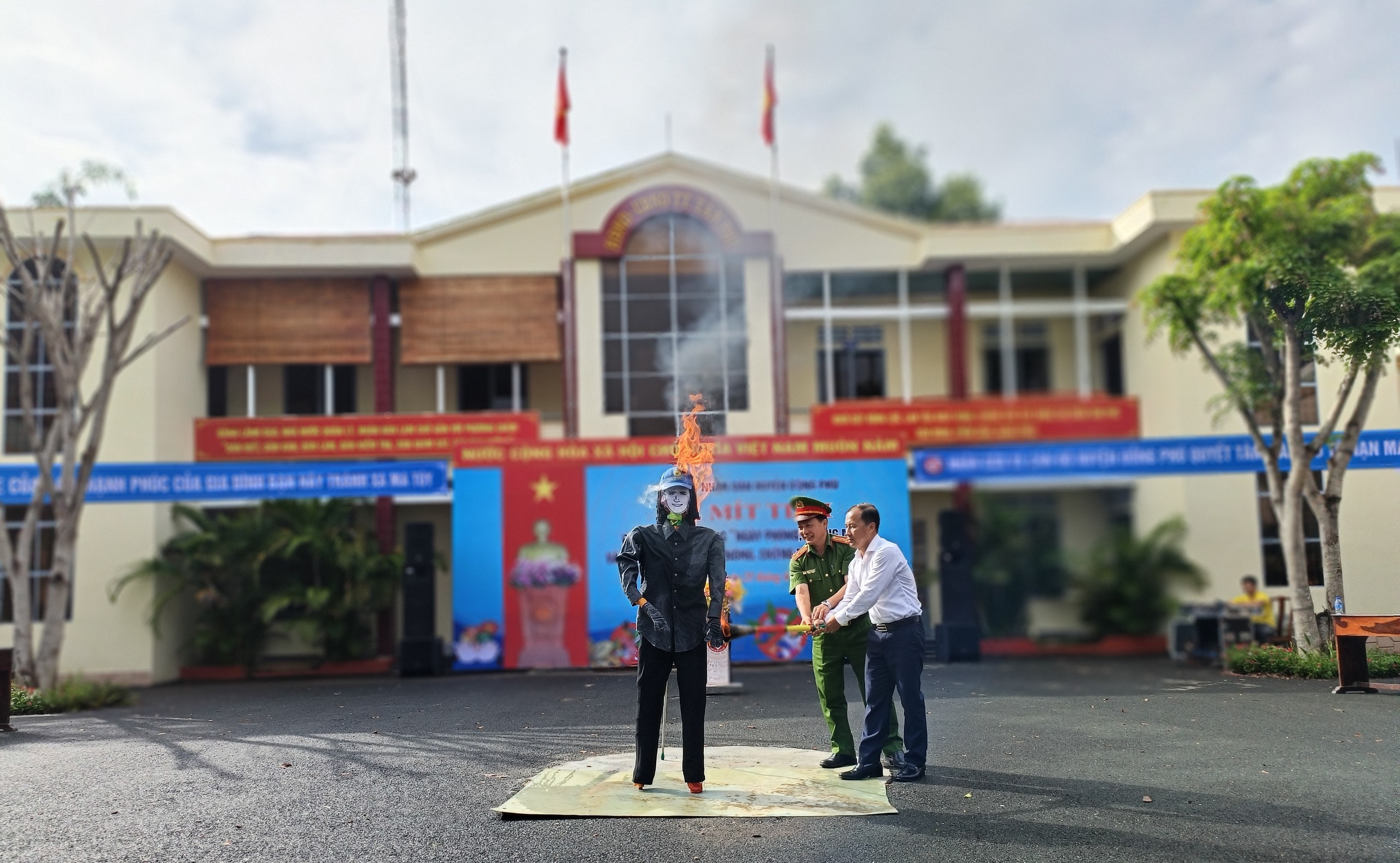 Chủ tịch UBND huyện Nguyễn Anh Tuấn và Trưởng Công an huyện Nguyễn Đức Minh đốt hình nộm biểu thị quyết tâm bài trừ tệ nạn ma túy