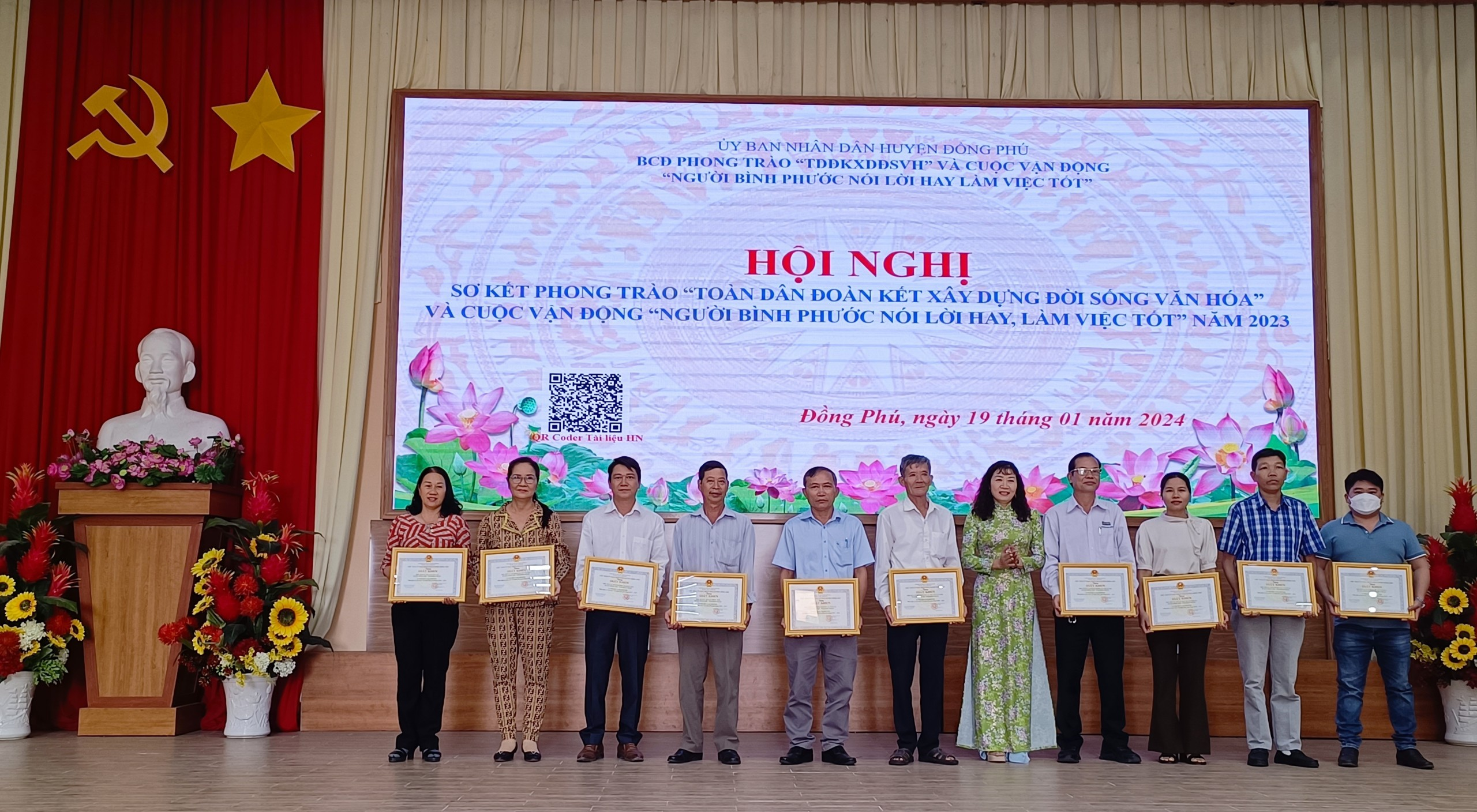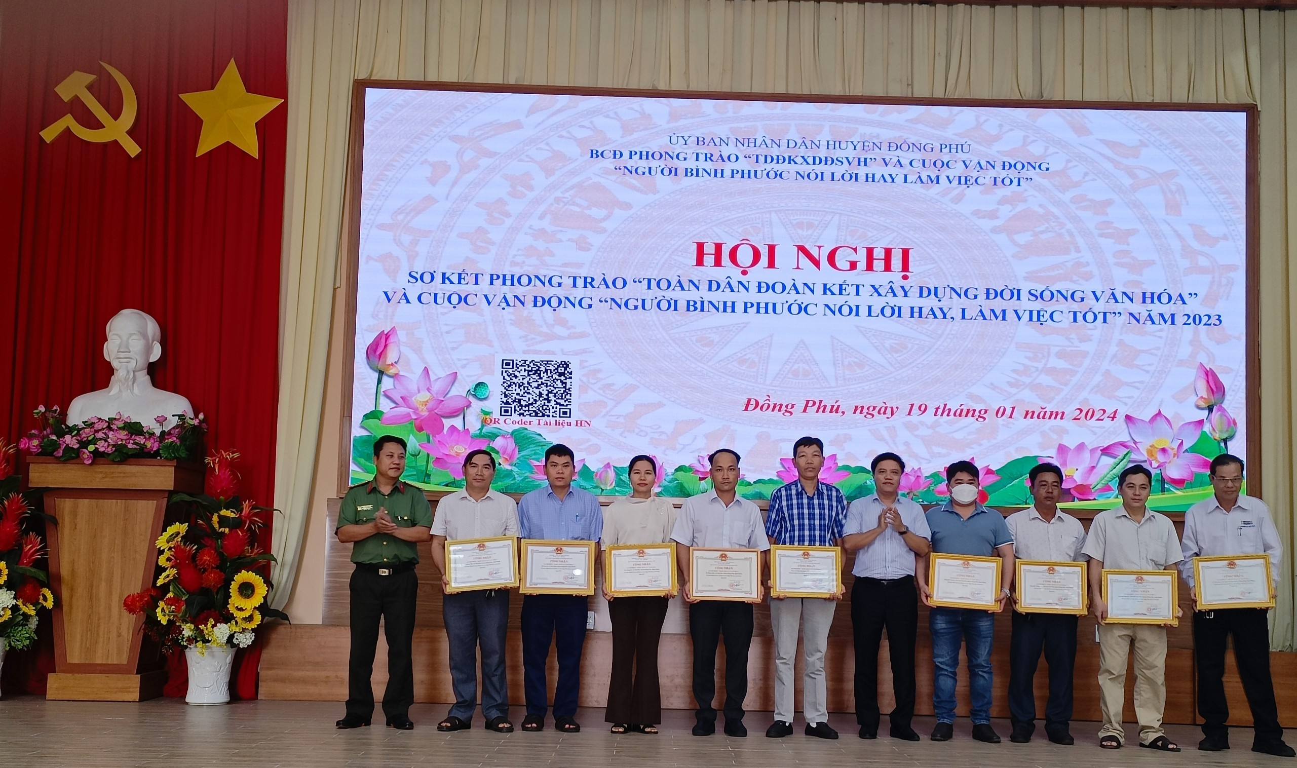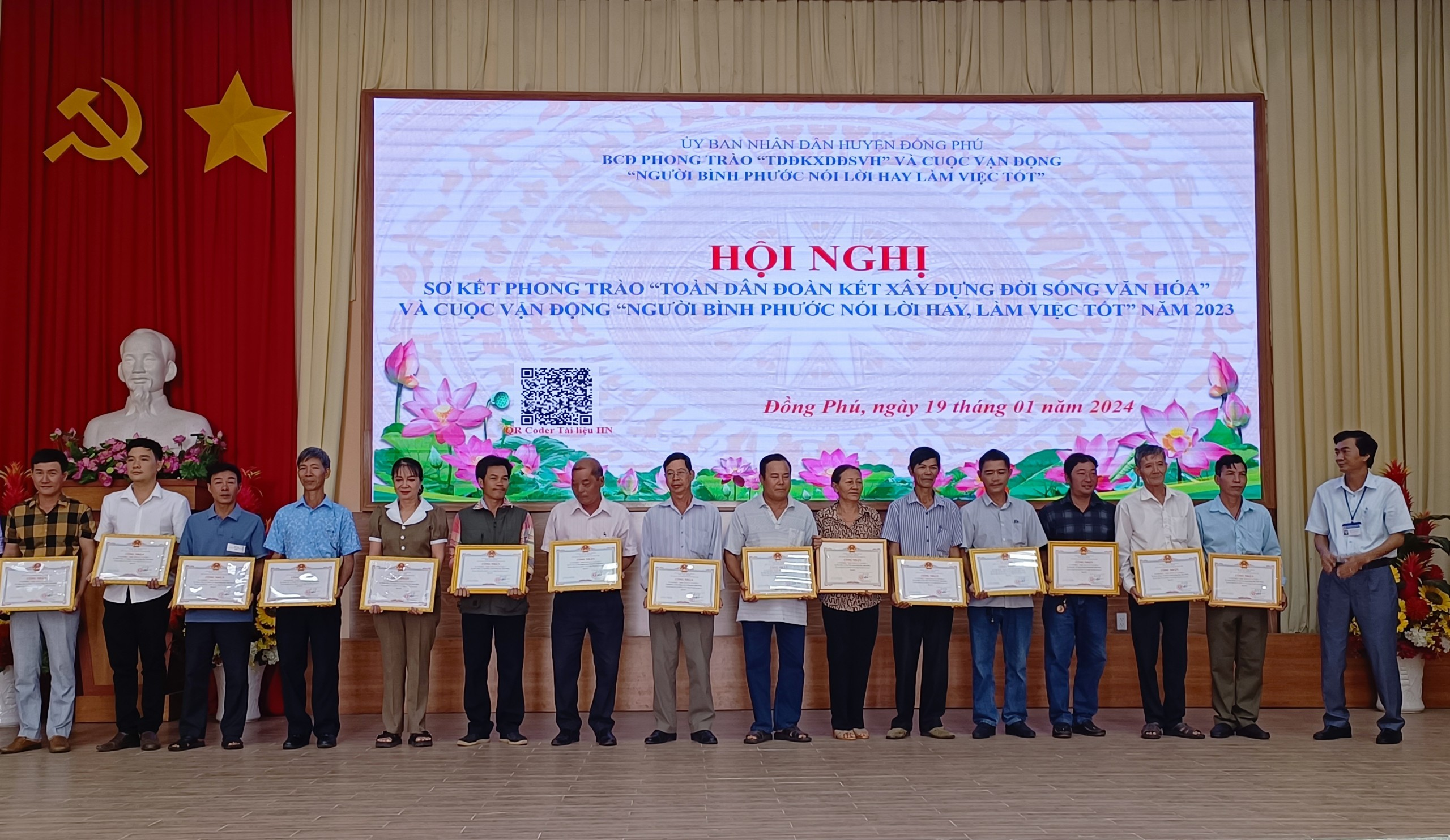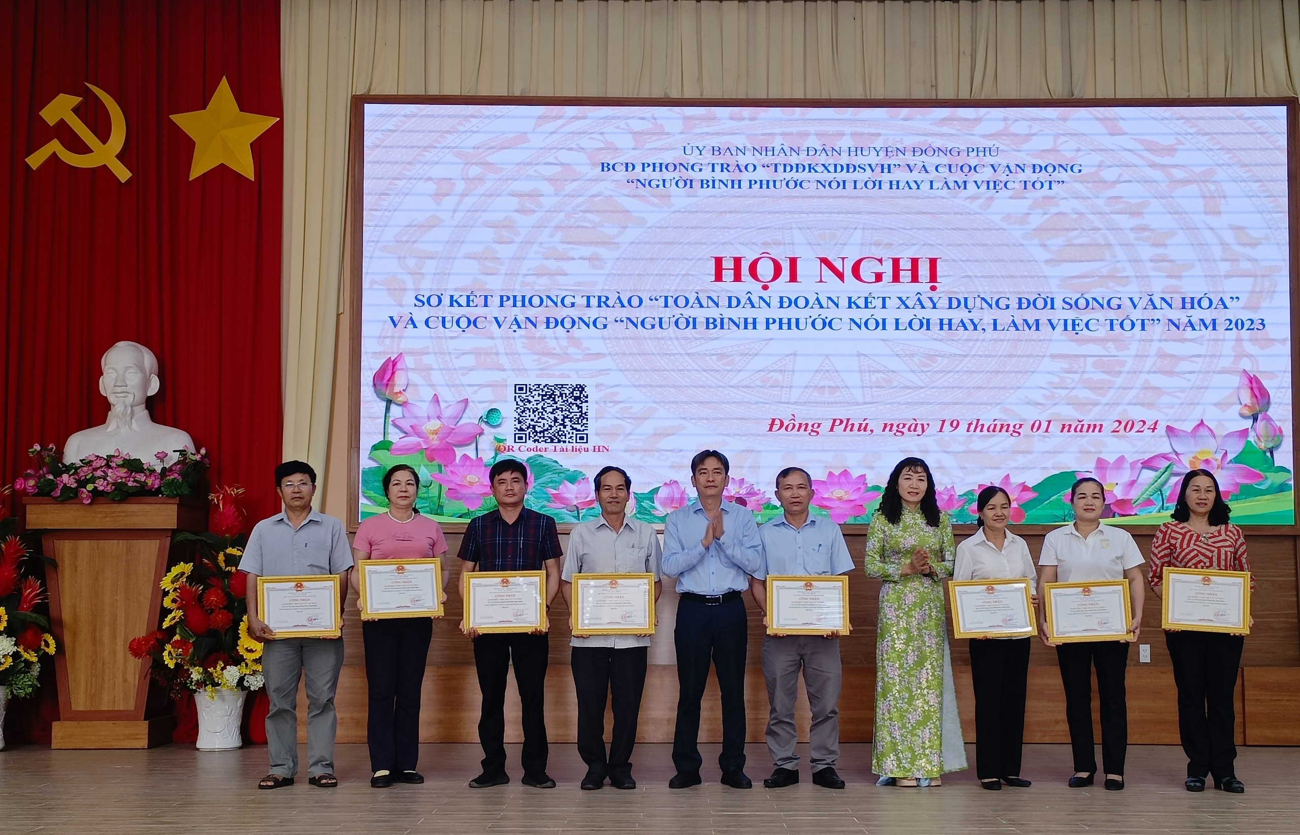 Nhân dịp này, UBND huyện Đồng Phú đã tặng giấy khen cho 10 khu dân cư đạt danh hiệu “Khu dân cư văn hóa” 5 năm liền và 72 khu dân cư đạt danh hiệu “Khu dân cư văn hóa” năm 2023.