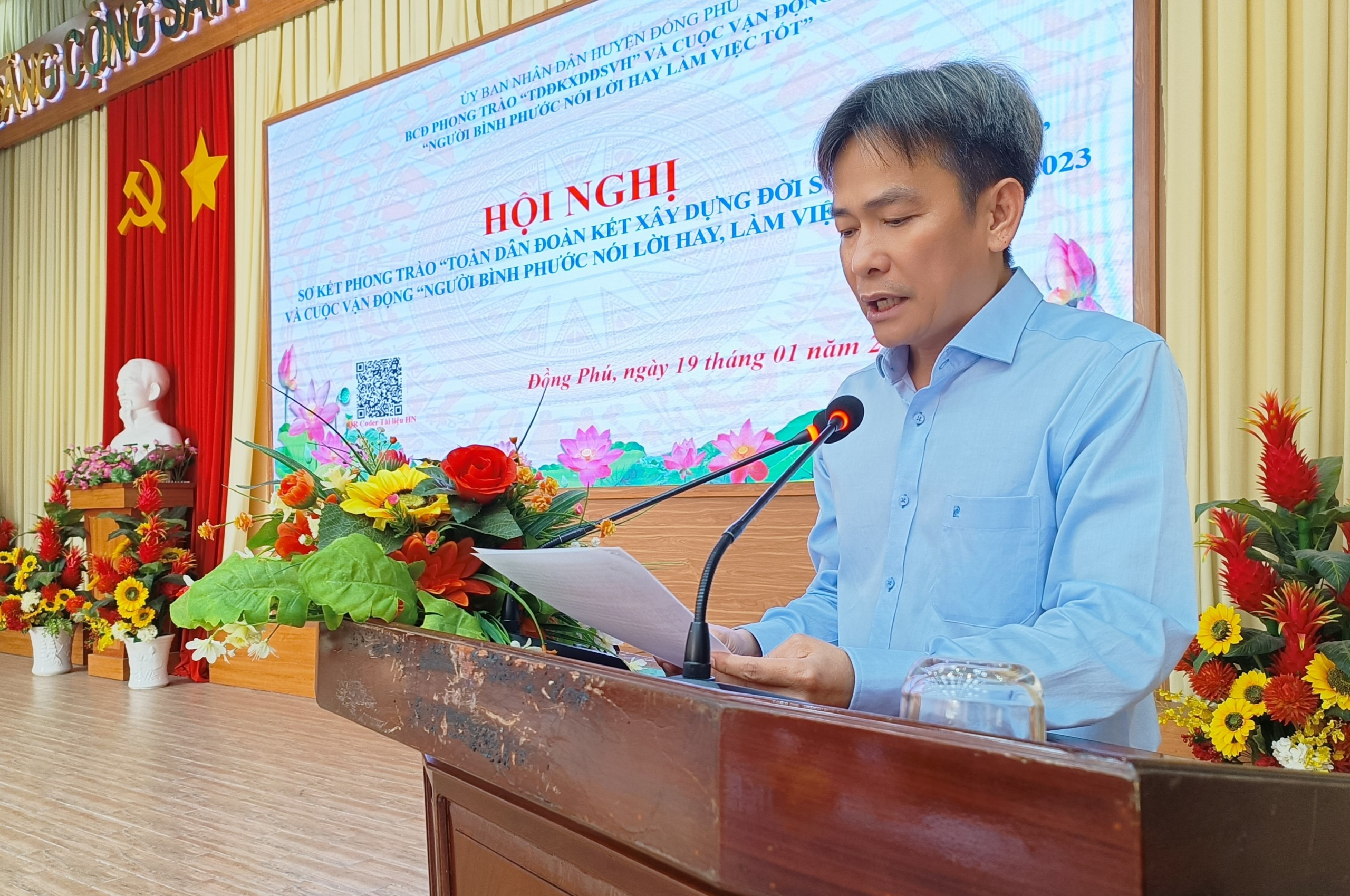 Phát biểu chỉ đạo, Phó chủ tịch UBND huyện Đồng Phú Nguyễn Thanh Phương đã đánh giá cao kết quả đạt được của Phong trào trong năm 2023. Thời gian tới, tiếp tục đẩy mạnh công tác tuyên truyền, vận động, nâng cao nhận thức của cấp ủy Đảng, chính quyền, các tầng lớp nhân dân tham gia phong trào hiệu quả và thiết thực nhất. Đồng thời, quán triệt sâu sắc Nghị quyết Hội nghị Trung ương IX khóa XI về xây dựng và phát triển văn hóa, con người Việt nam đáp ứng yêu cầu phát triển bền vững đất nước; đẩy mạnh các hoạt động văn hóa gắn với Học tập và làm theo tư tưởng, đạo đức, phong cách Hồ Chí Minh, hướng đến mọi người làm việc tốt, cả xã hội làm việc tốt. Đồng thời, tăng cường lồng ghép hiệu quả phong trào với các chương trình mục tiêu quốc gia; tuyên dương, khen thưởng kịp thời những cách làm hay, gương điển hình tiên tiến. Các cơ quan thành viên Ban chỉ đạo tăng cường phối hợp cơ quan thường trực, các địa phương gắn với phong trào thi đua của ngành, tổ chức mình để đẩy mạnh phong trào “Toàn dân đoàn kết xây dựng đời sống văn hóa” đến với mọi tầng lớp nhân dân.