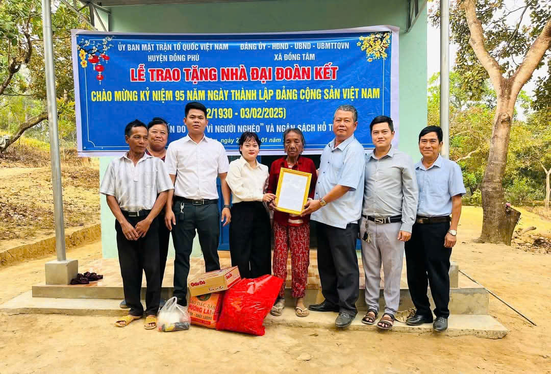Ngày 23/01/2025, Đảng ủy – HĐND - UBND- UBMTTQ Việt Nam xã Đồng Tâm phối hợp với Phòng Dân tộc huyện Đồng Phú tổ chức Lễ trao tặng nhà Đại đoàn kết cho hộ bà Điểu Thị Lóc, dân tộc Stiêng, ngụ tại Ấp 4, xã Đồng Tâm, là hộ nghèo trên địa bàn xã.