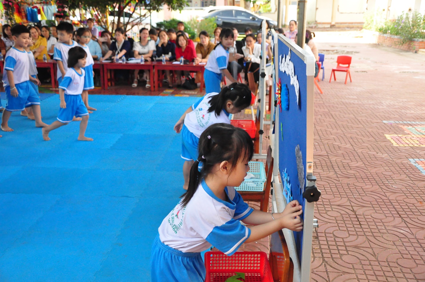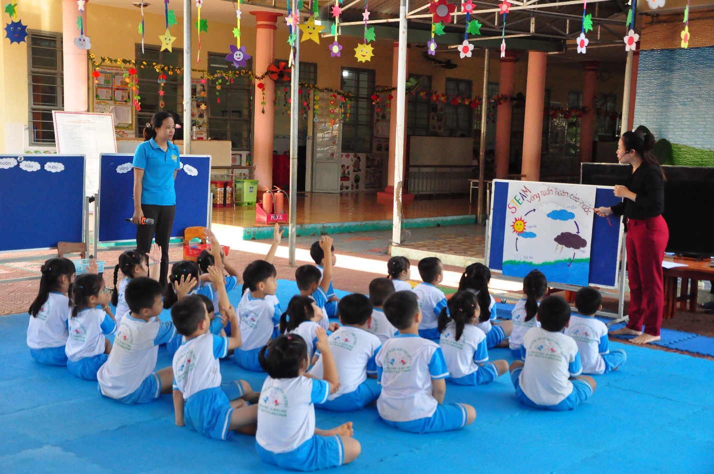 Tại hội giảng, cán bộ, giáo viên được theo dõi hoạt động dạy học với đề tài “vòng tuần hoàn nước”. Ở hoạt động này, giáo viên sẽ kết hợp chuyên đề giáo dục lấy trẻ làm trung tâm với giáo dục STEM nhằm giúp trẻ nhận biết cơ bản vòng tuần hoàn của nước. Từ việc nước bốc hơi ngưng tụ thành mây, gặp không khí lạnh ngưng tụ lại thành đám mây lớn, sau đó tạo thành mưa. Đặc biệt, từ vòng tuần hoàn của nước, trẻ sẽ biết áp dụng vào việc trồng, chăm sóc rau xanh, biết được tầm quan trọng của nước đối với sự sống trên trái đất. Qua đó trẻ sẽ có ý thức giữ gìn nguồn nước và sử dụng nước tiết kiệm.