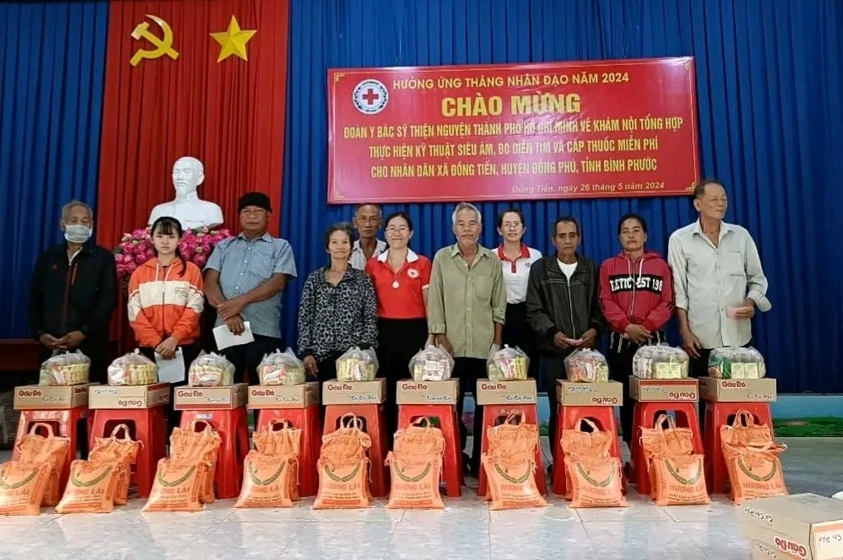 Sáng 26-5, Hội Chữ thập đỏ huyện Đồng Phú, hội Chữ Thập đỏ xã Đồng Tiến phối hợp với Đoàn Y bác sỹ thiện nguyện Thành phố Hồ Chí Minh tổ chức chương trình khám bệnh, cấp thuốc miễn phí và tặng quà cho người dân có hoàn cảnh khó khăn trên địa bàn xã Đồng Tiến.