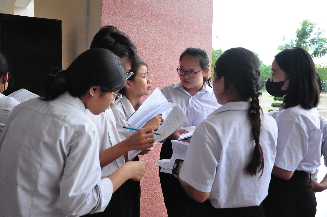 Thí sinh Nguyễn Thị Kim Chi và thí sinh Bùi Nguyễn Nhật Anh, Điểm thi Trường THPT Đồng Phú tranh thủ trao đổi, thảo luận bài thi môn Ngữ văn sáng nay