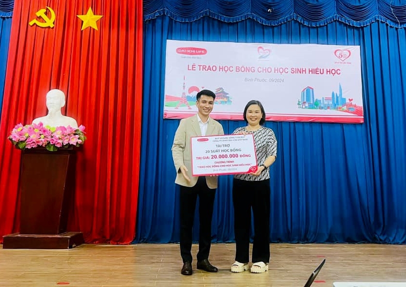 20 suất học bổng, mỗi suất trị giá 1 triệu đồng đã được trao tận tay 20 em học sinh vượt khó học tốt. Toàn bộ số học bổng đều do Công ty Bảo hiểm nhân thọ Dai- Ichi Việt Nam tài trợ. Đây chính là nguồn động viên to lớn để các em có vững tin trong năm học mới.