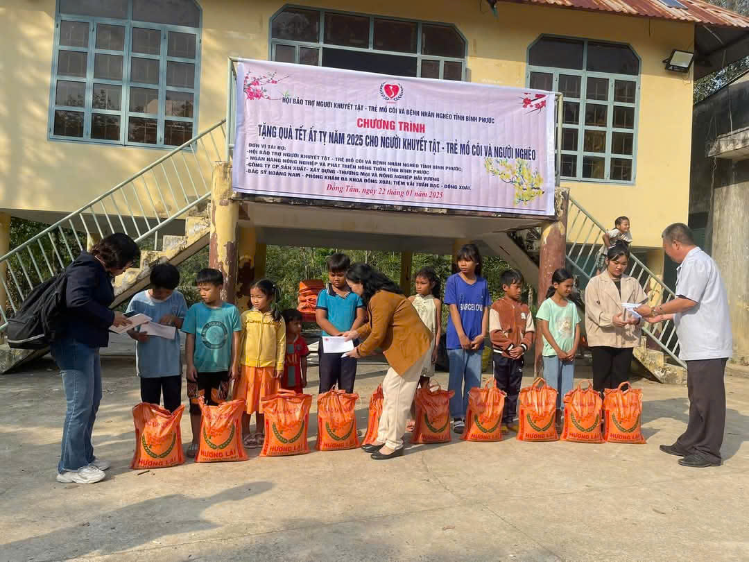 Chiều ngày 21/01/2025, tại Nhà văn hóa ấp 1, xã Đồng Tâm, Hội bảo trợ người khuyết tật, trẻ em mồ côi và bệnh nhân nghèo tỉnh Bình Phước phối hợp với UBND xã Đồng Tâm và các đơn vị tài trợ đã tổ chức chương trình  tặng quà Tết Ất Tỵ cho trẻ em mồ côi, các hộ gia đình có hoàn cảnh đặc biệt khó khăn trên địa bàn xã nhân dịp Tết cổ truyền năm 2025.