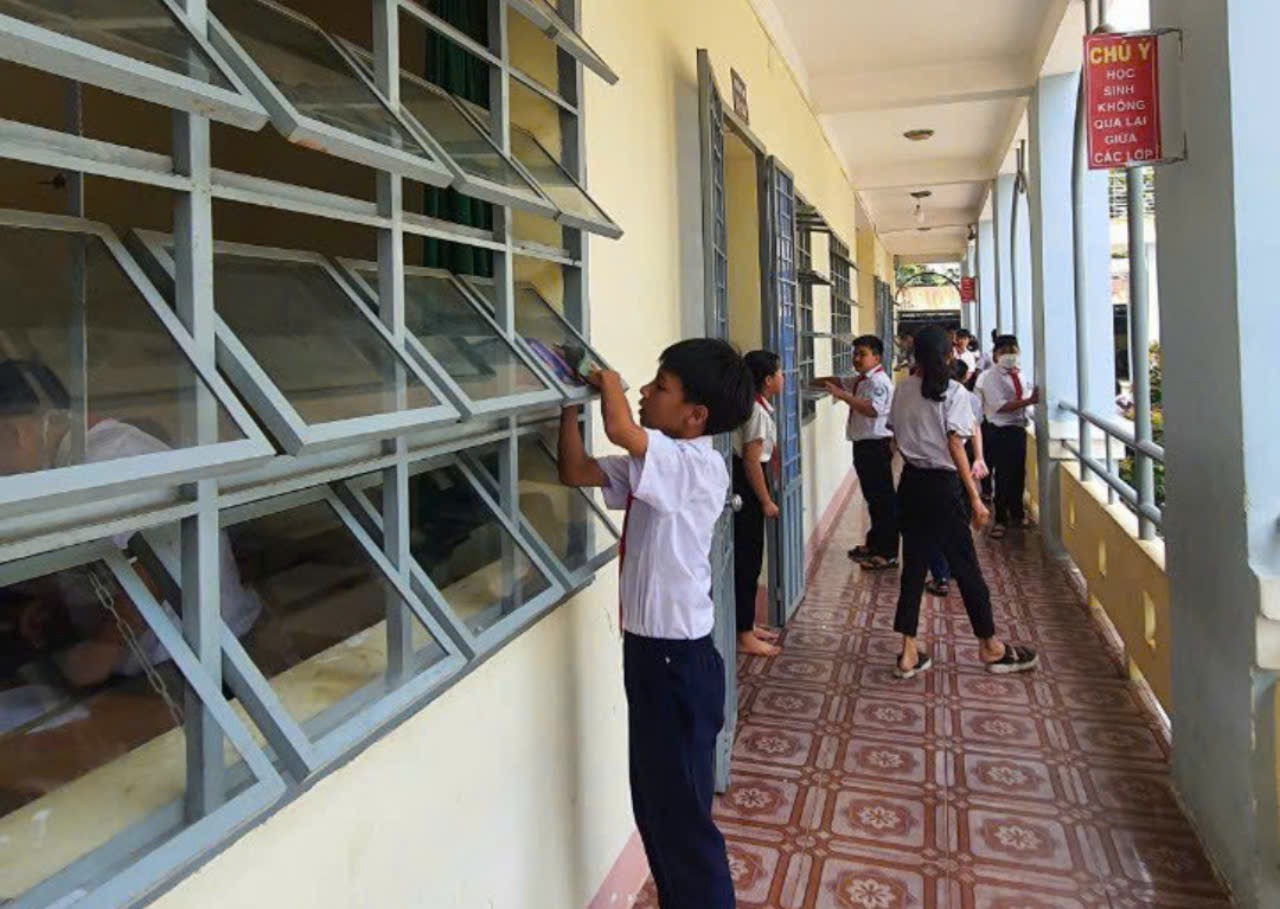 Học sinh trường THCS Tân Phú vệ sinh trường lớp chuẩn bị cho năm học mới